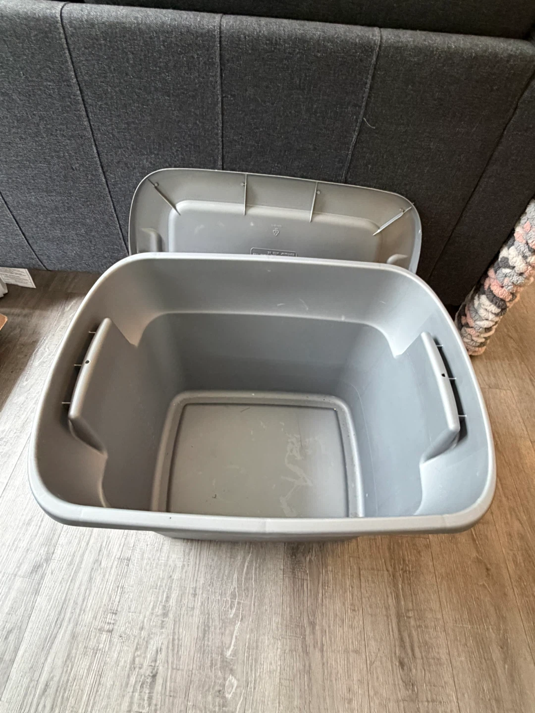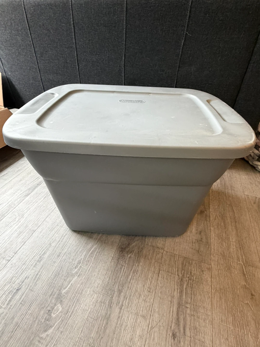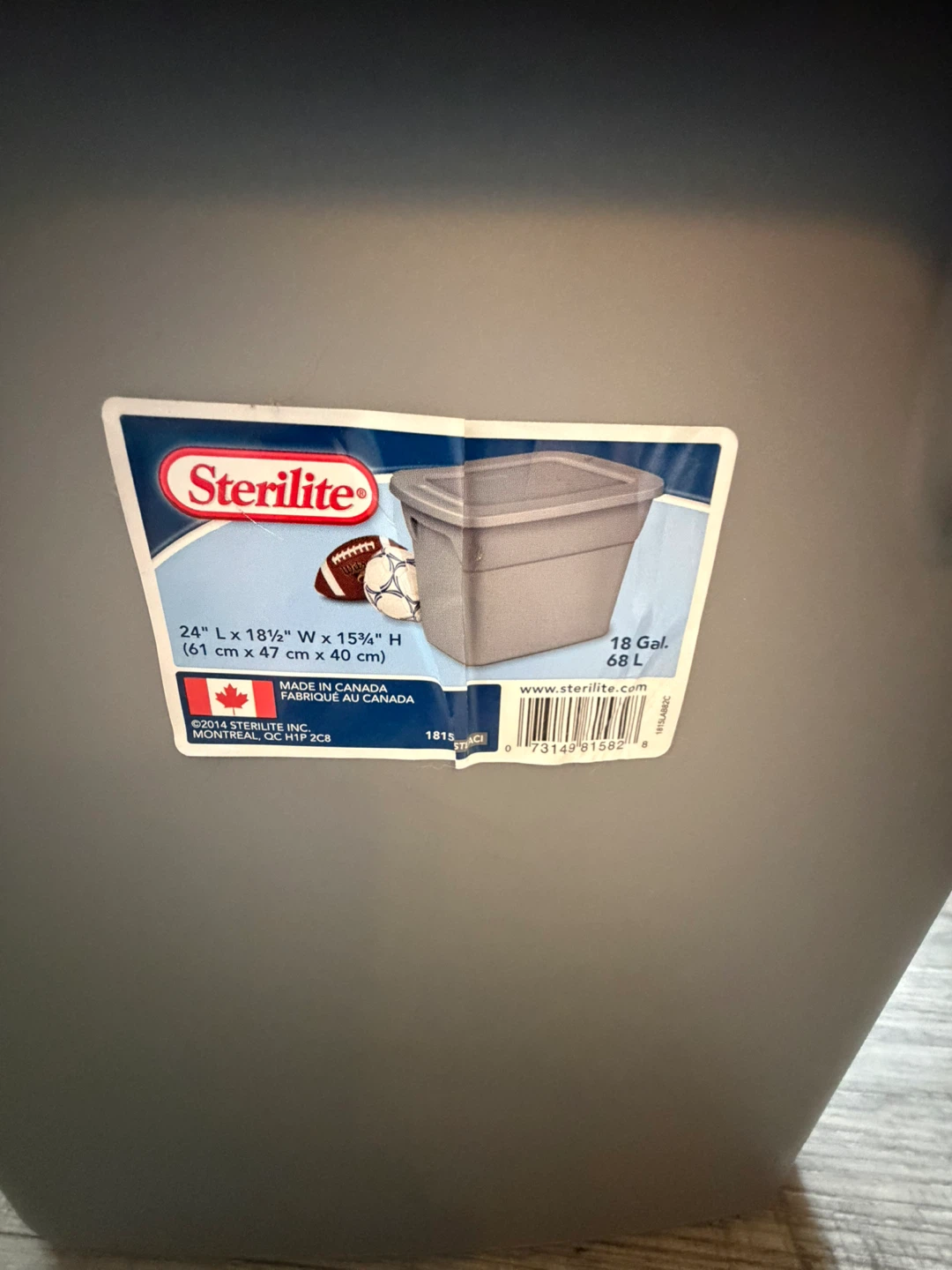 Grey Sterilite storage bin with lid. Dimensions are 24" L x 18½" W x 15¾" H (61 cm x 47 cm x 40 cm). This bin is 18 Gallons or 68 Litres.