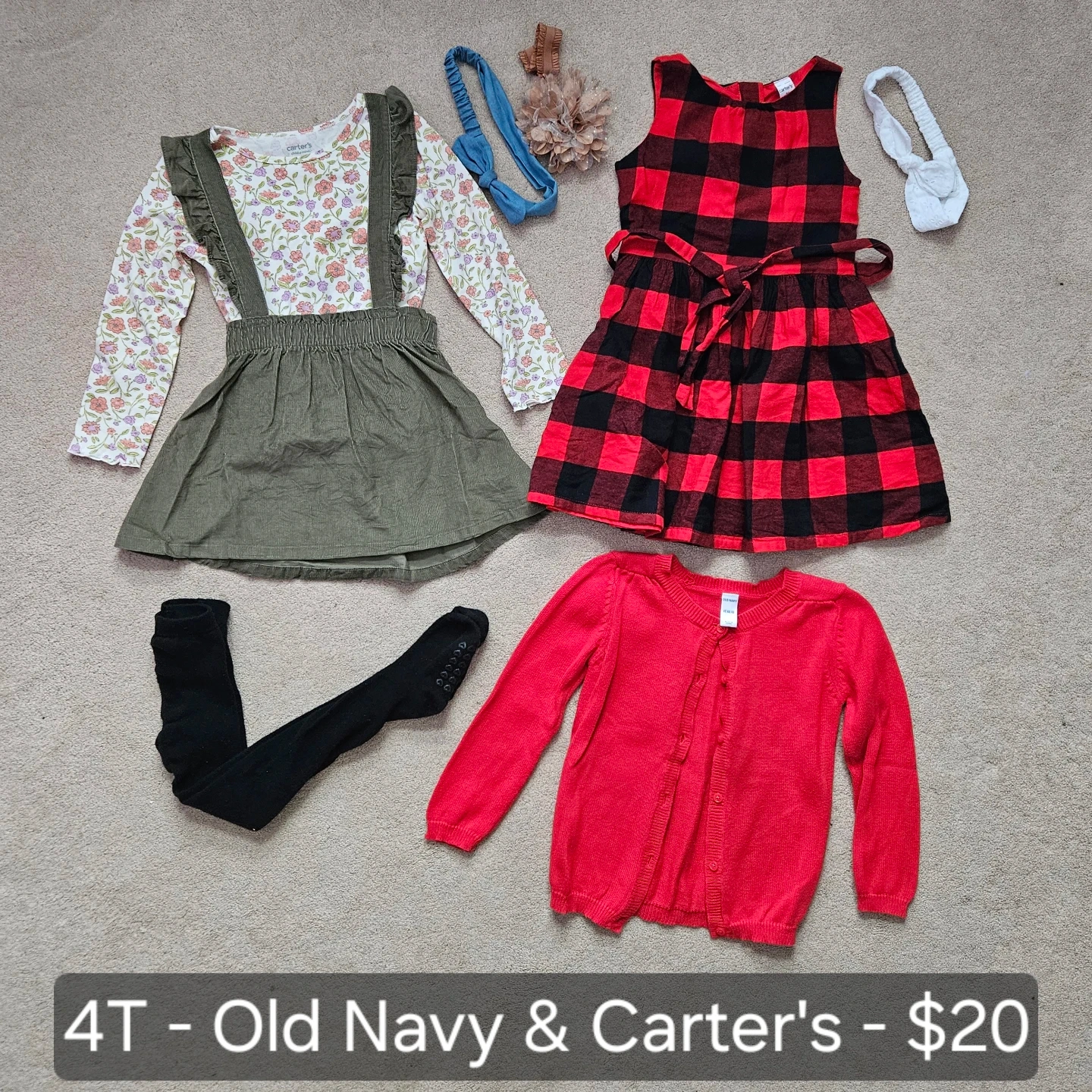 This lot includes a floral print dress with suspenders, a red and black buffalo plaid dress, a red knit cardigan, and black tights. It's size 4T and from Old Navy and Carter's brands.