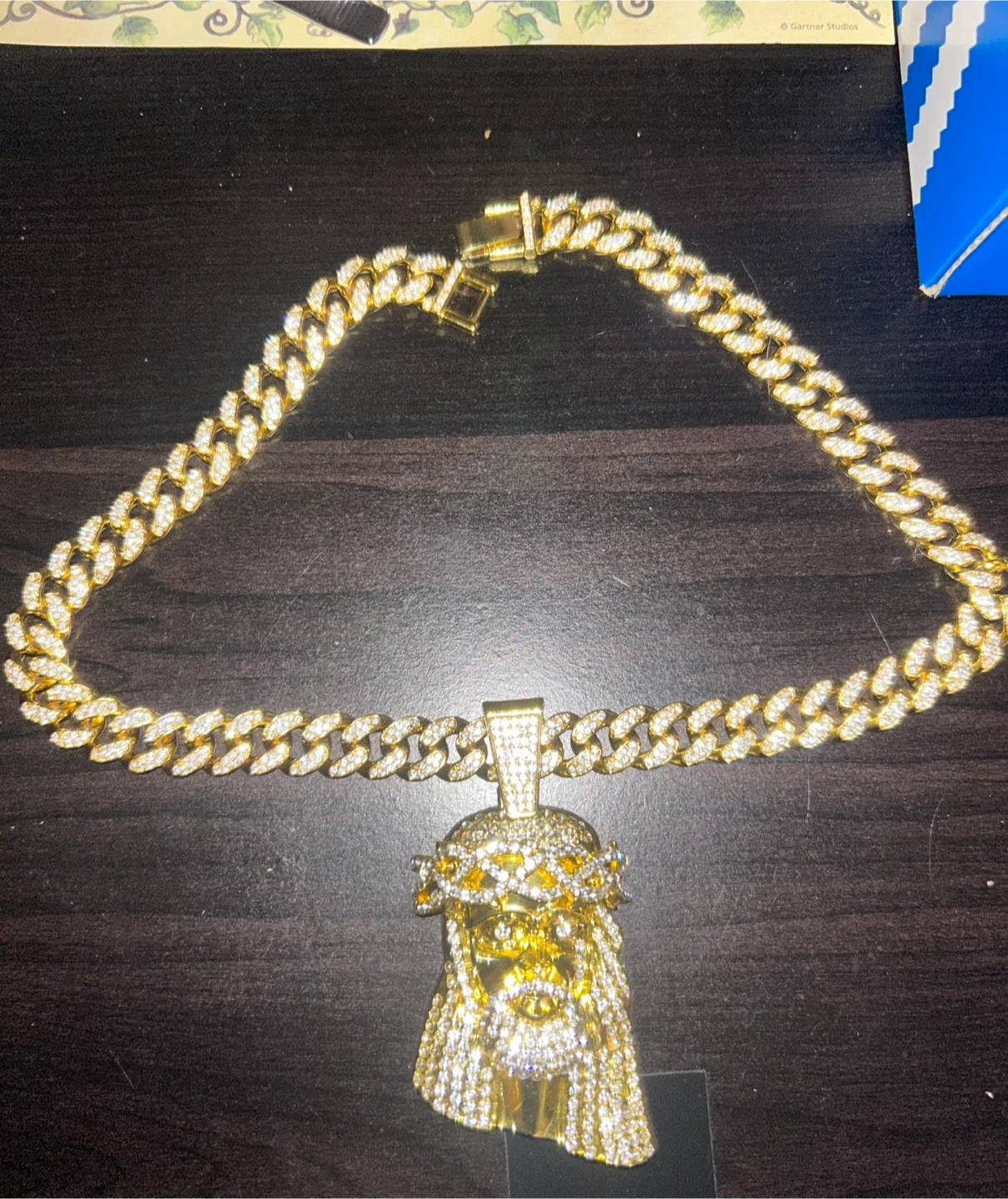 Selling a gold Jesus piece pendant necklace. It's a beautiful piece that adds a touch of bling to any outfit. The pendant is detailed and eye-catching, perfect for those who love statement jewelry