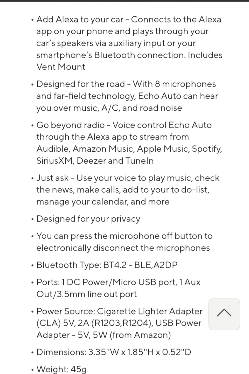 Selling an Amazon Echo Auto! Connects to the Alexa app on your phone and plays through your car's speakers via auxiliary input or your smartphone's Bluetooth connection. Includes Vent Mount. Designed for the road with 8 microphones and far-field technology. You can press the microphone off button for privacy. Dimensions: 3.35"W x 1.85"H x 0.52"D