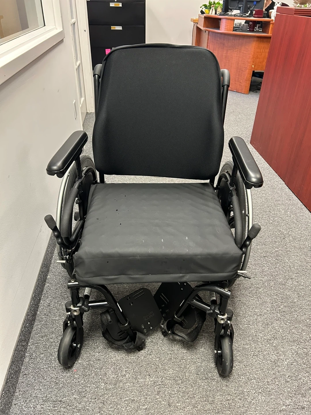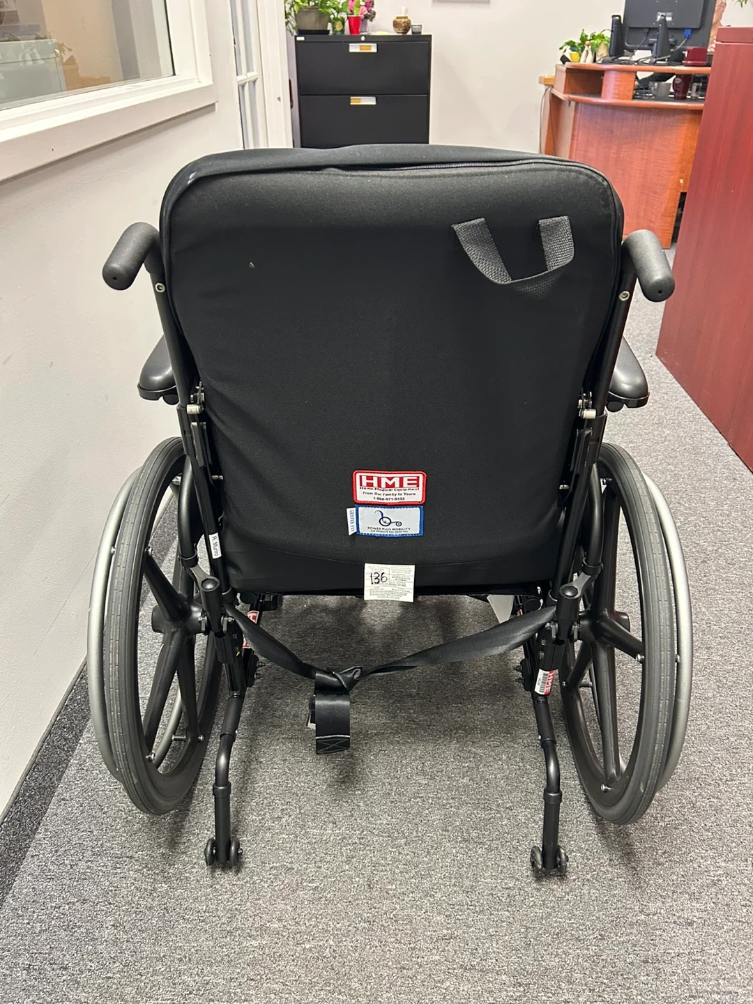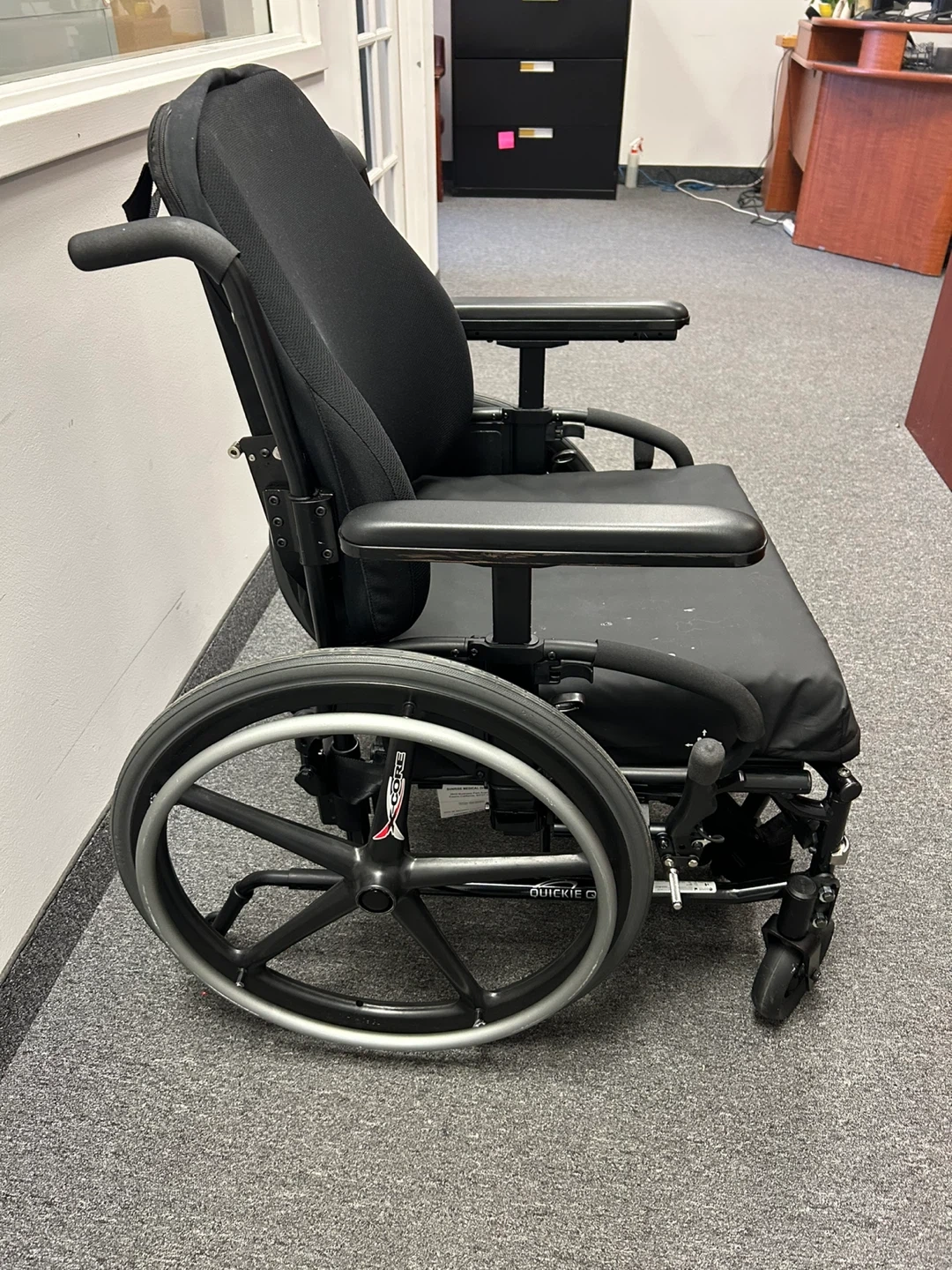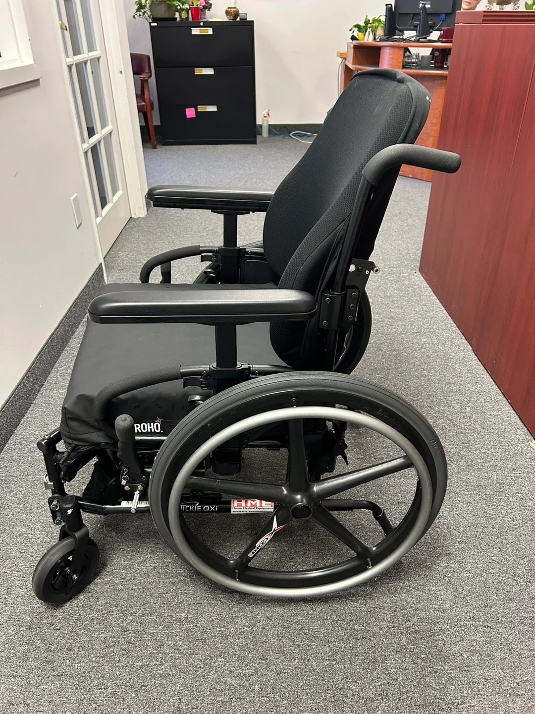 This is a black HME Quickie Gxi wheelchair. It has large rear wheels and smaller front casters for manoeuvrability. The seat and back are padded for comfort. It includes armrests. Barely used.