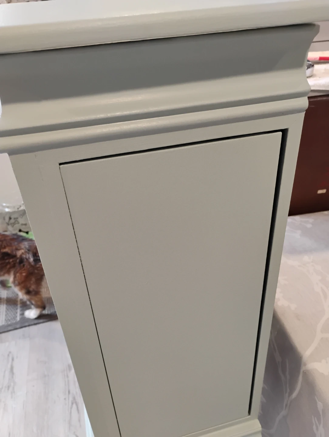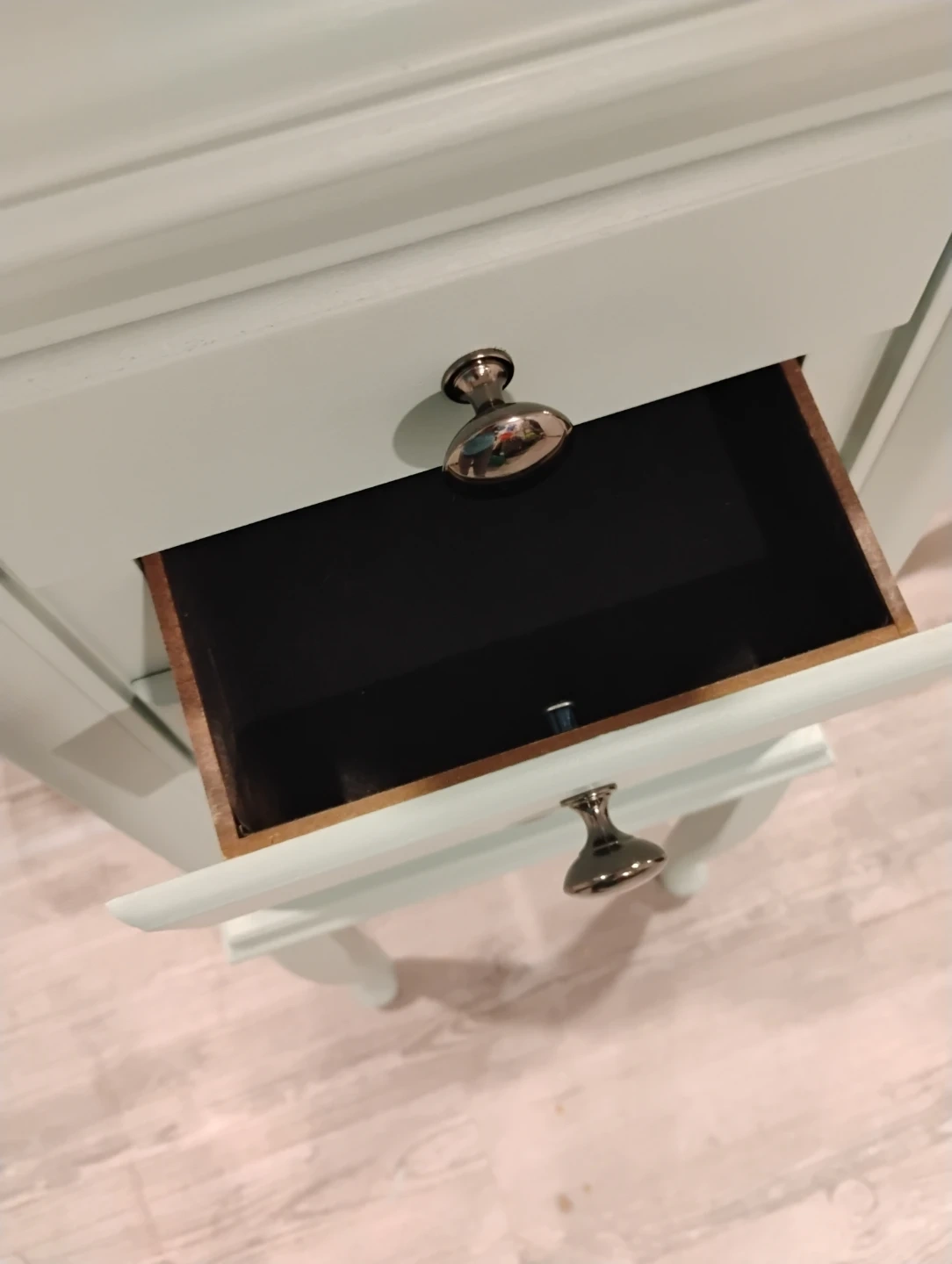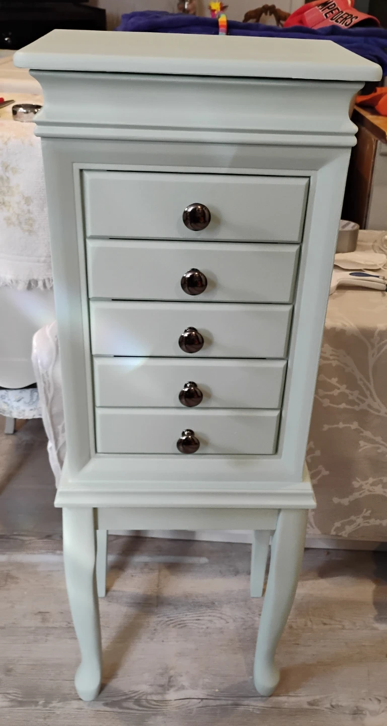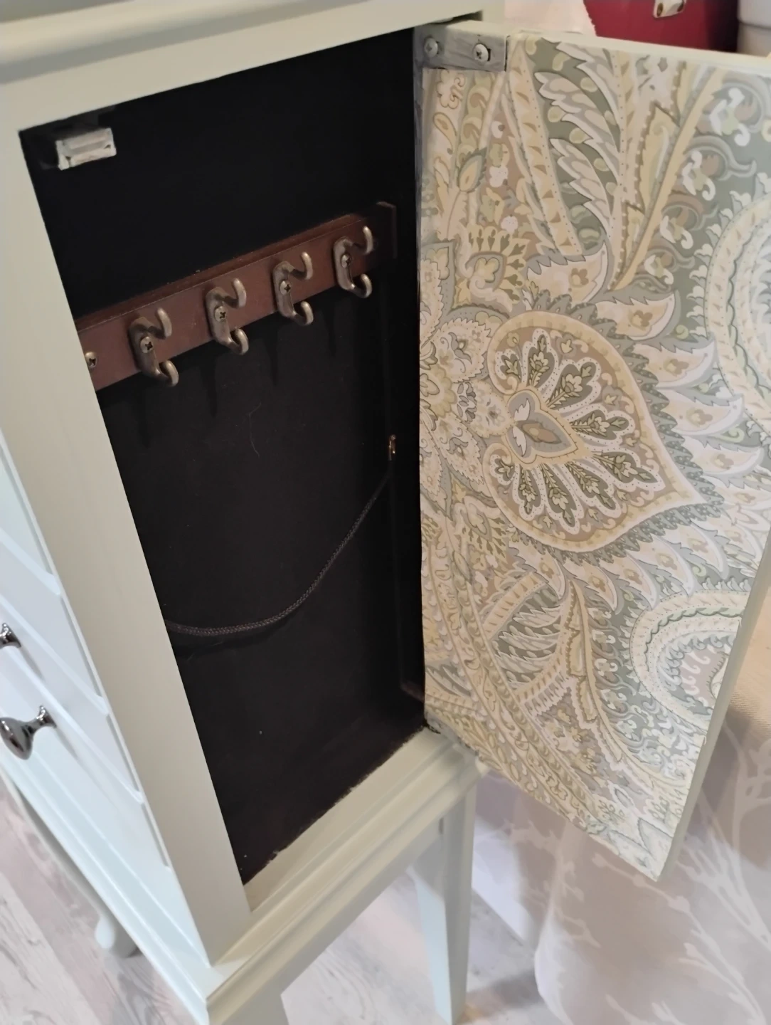 This light green freestanding jewelry armoire features a mirrored lid and multiple velvet lined drawers for storage. It includes hooks inside for hanging necklaces or bracelets. Paisley vinyl on doors interior. A great way to keep your accessories organized!
