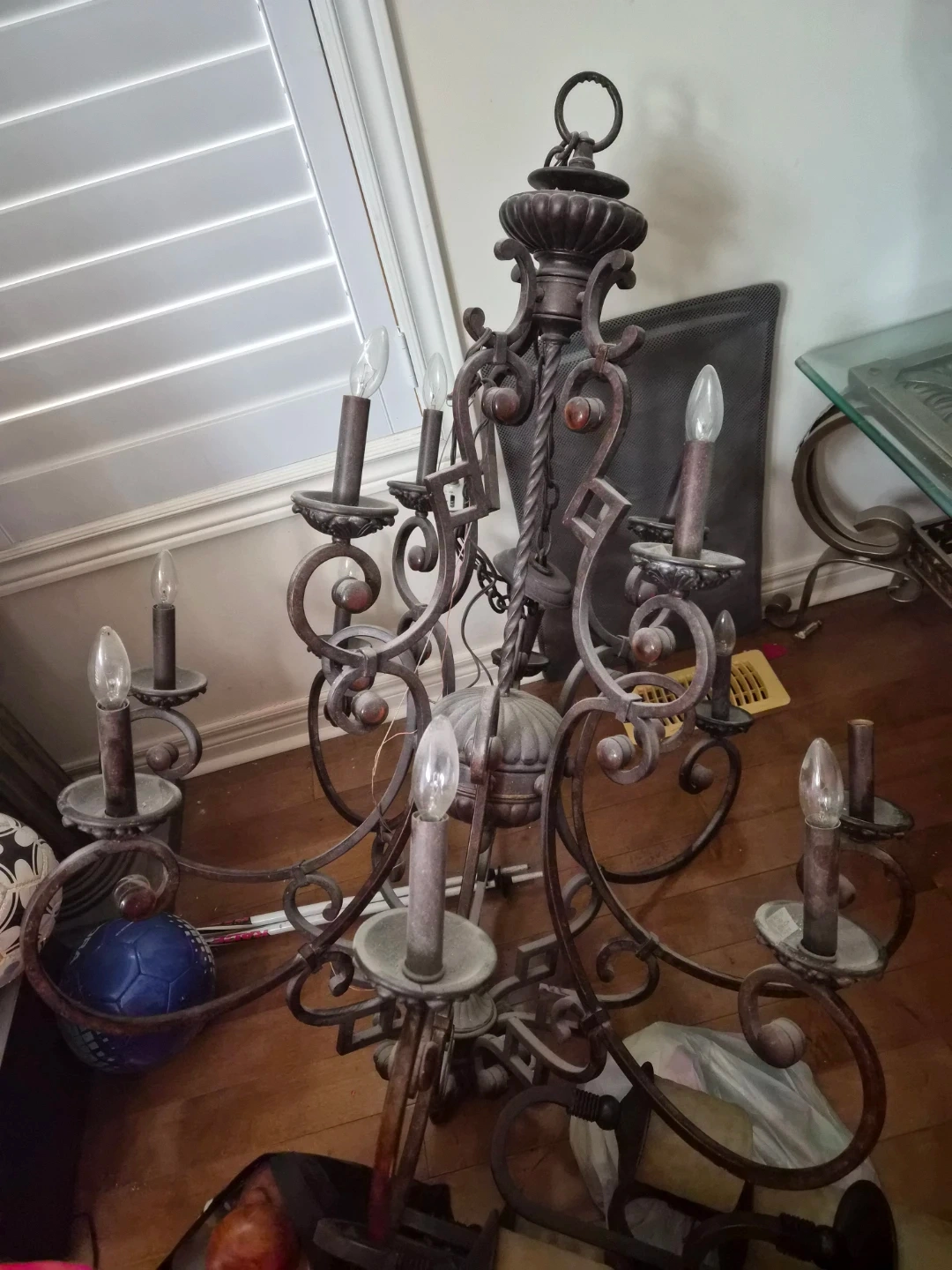 Selling 1set of wrought iron chandelier. Large 38x38x58 inch plus chain. Small for the Foyle 17x17x19 inch. It has a rustic, vintage look with decorative scrollwork and amber accents. It would be a nice addition to a stair case . Bought over $1000. Renovation sale