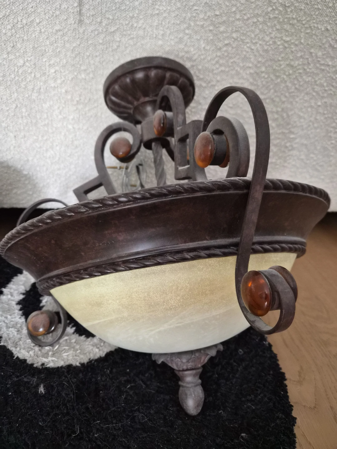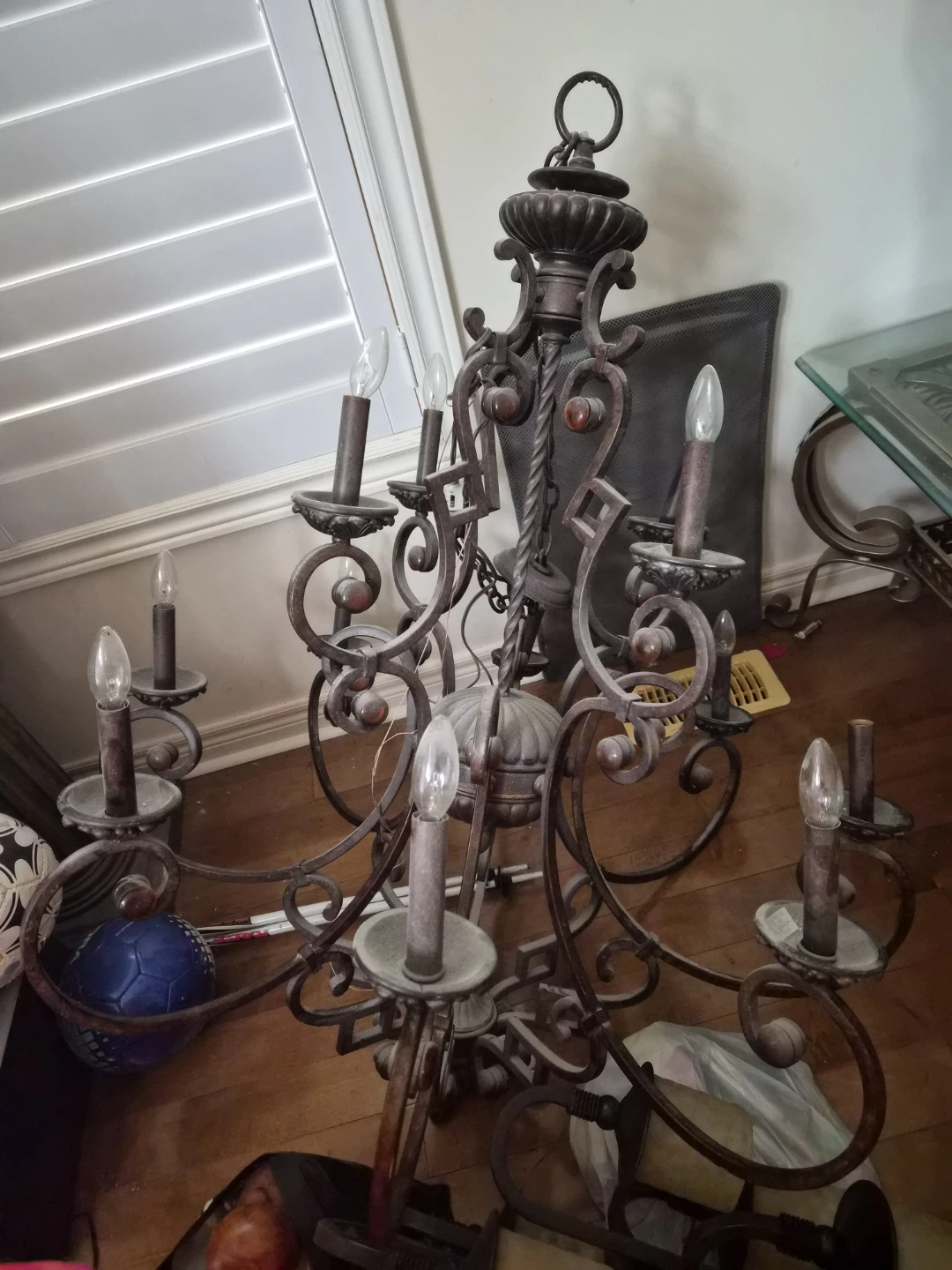 Selling 1set of wrought iron chandelier. Large 38x38x58 inch plus chain. Small for the Foyle 17x17x19 inch. It has a rustic, vintage look with decorative scrollwork and amber accents. It would be a nice addition to a stair case . Bought over $1000. Renovation sale