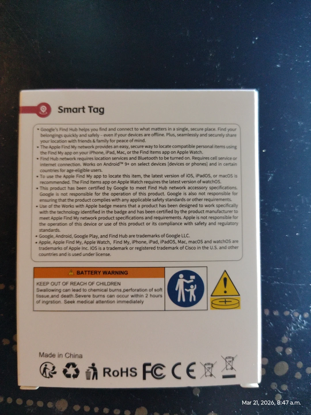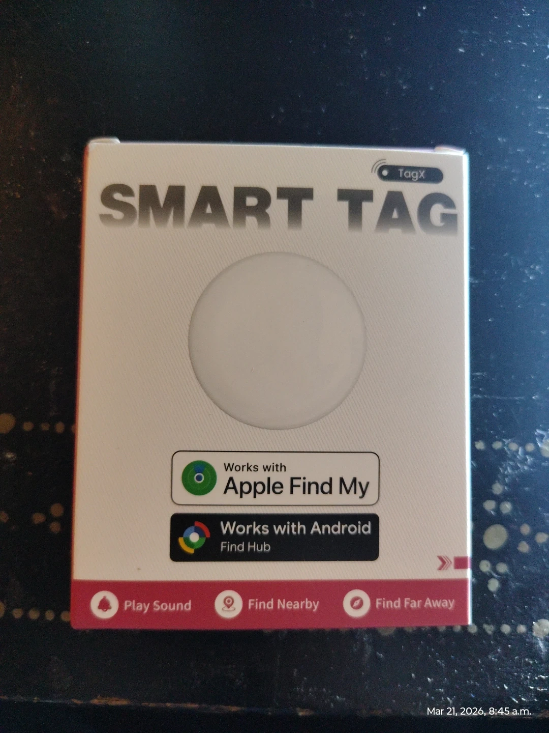 This TagX Smart Tag helps you track your belongings. It works with Apple Find My and Android Find Hub. You can play a sound, find nearby, or find far away. Never opened.