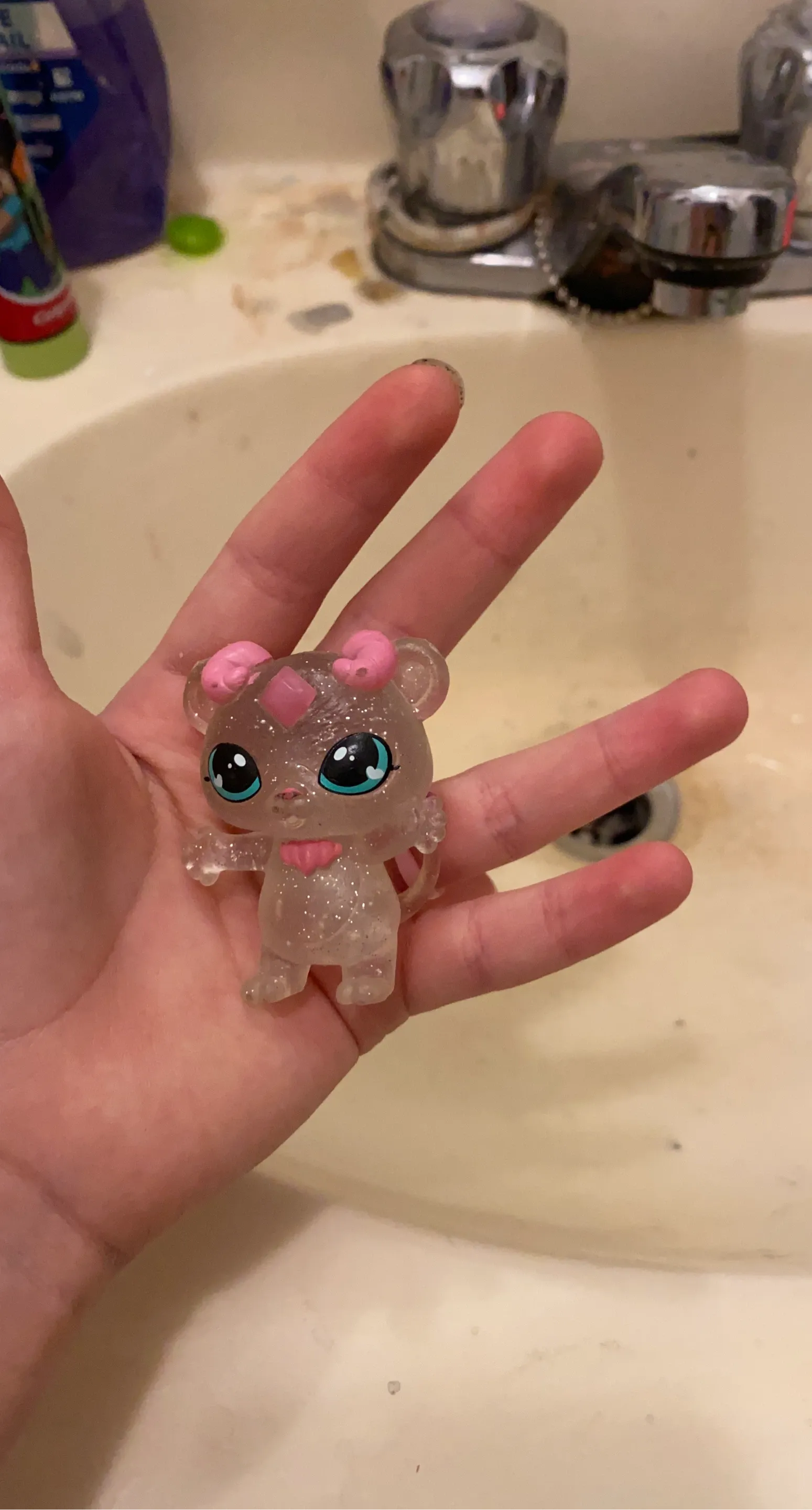 This is a cute, clear, sparkly pet figurine with pink accents. It's a fun collectible toy. The figurine is made of plastic.