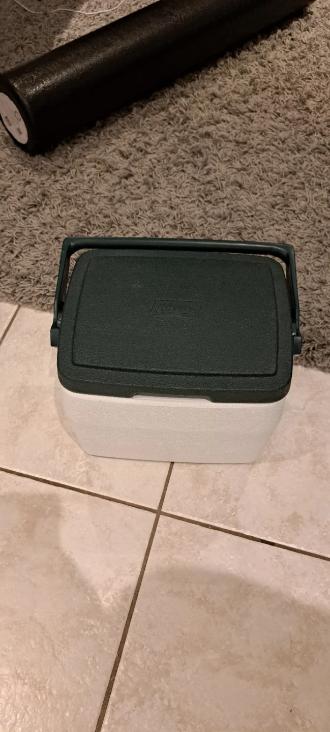 Donating a Coleman cooler in good condition! It's a classic green and white colour, perfect for picnics, camping, or keeping your drinks cold on a hot day