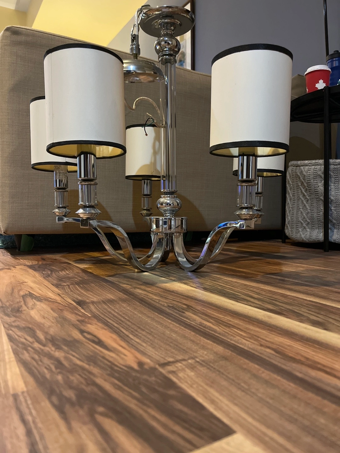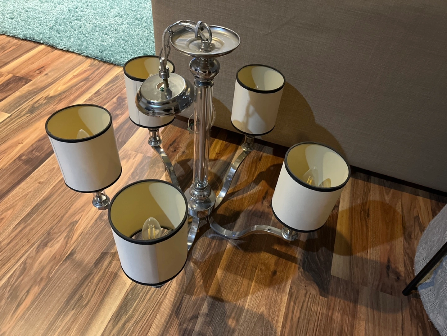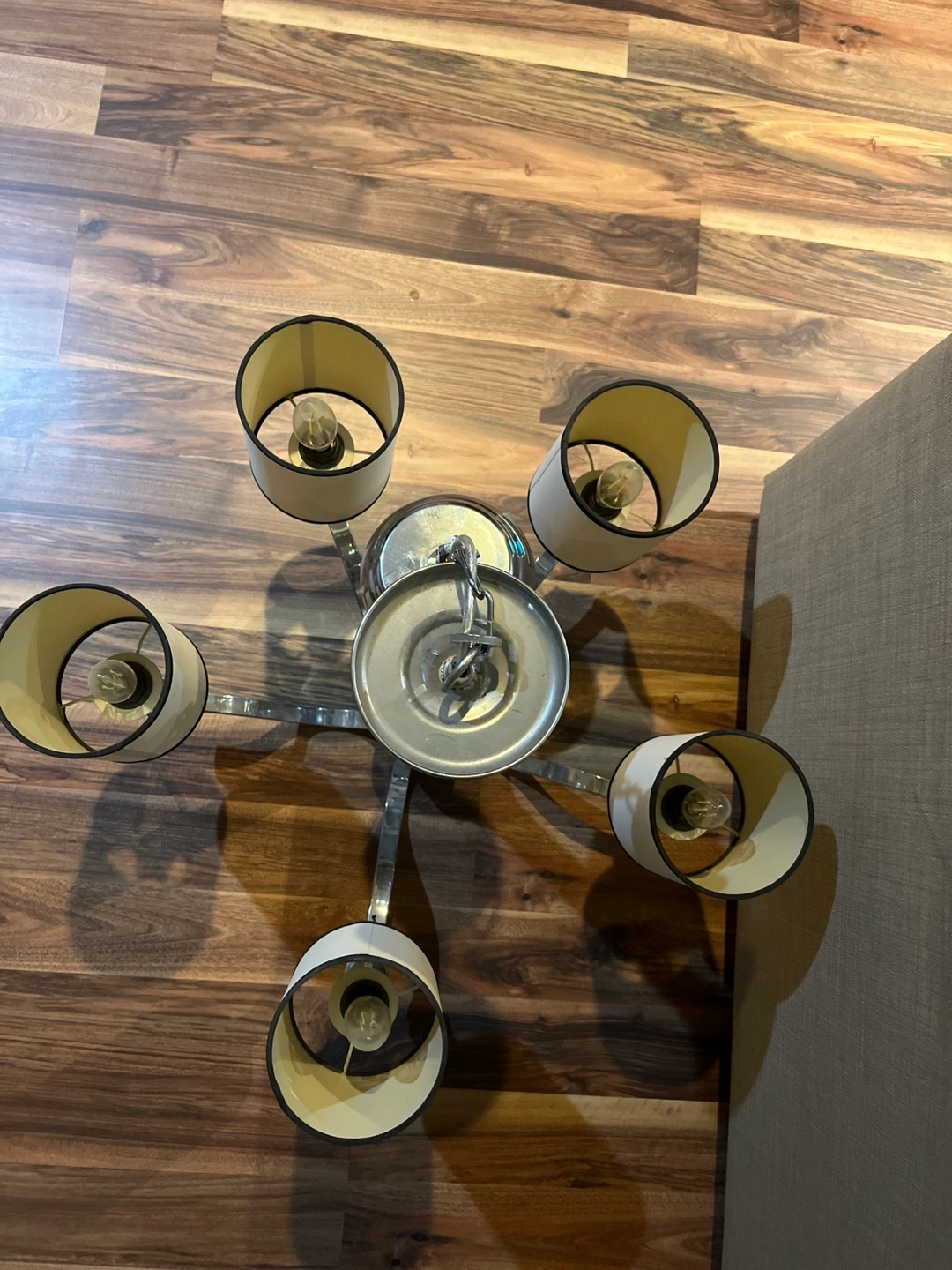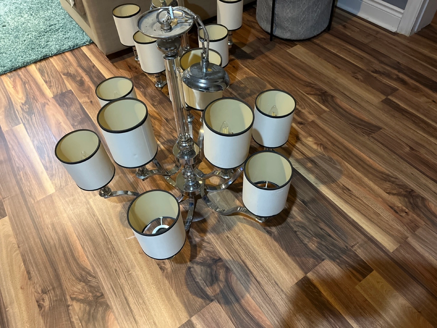 Beautiful chandelier, chrome finish. Twelve off-white shades with black trim. Looks great in a dining room or living room.50$Dollars each chandelier!!All together 150$!!!!!
