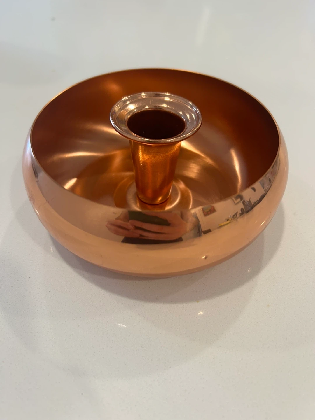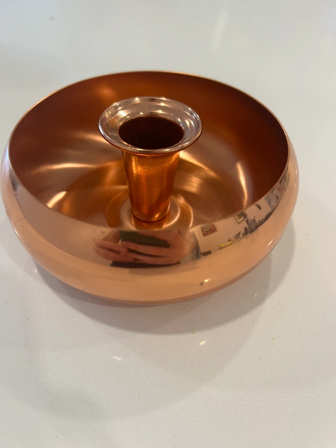 A lovely copper candlestick holder with a wide base. It's made of copper and has a centre piece for a candle. This holder adds a warm touch to any table setting.