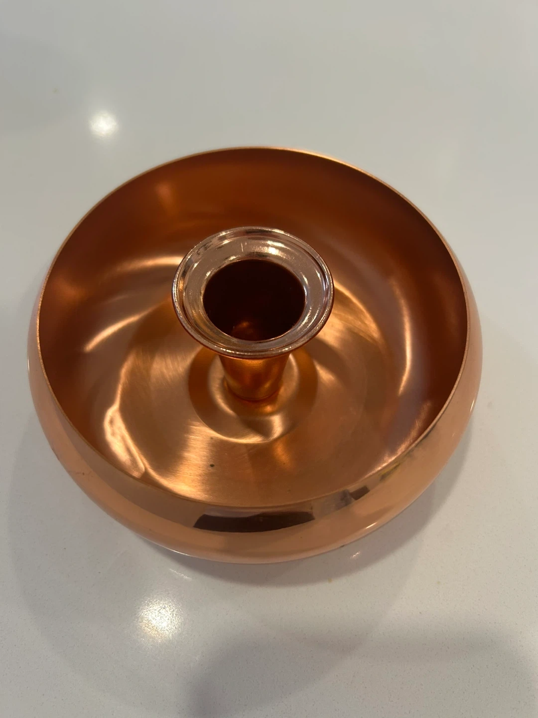A lovely copper candlestick holder with a wide base. It's made of copper and has a centre piece for a candle. This holder adds a warm touch to any table setting.