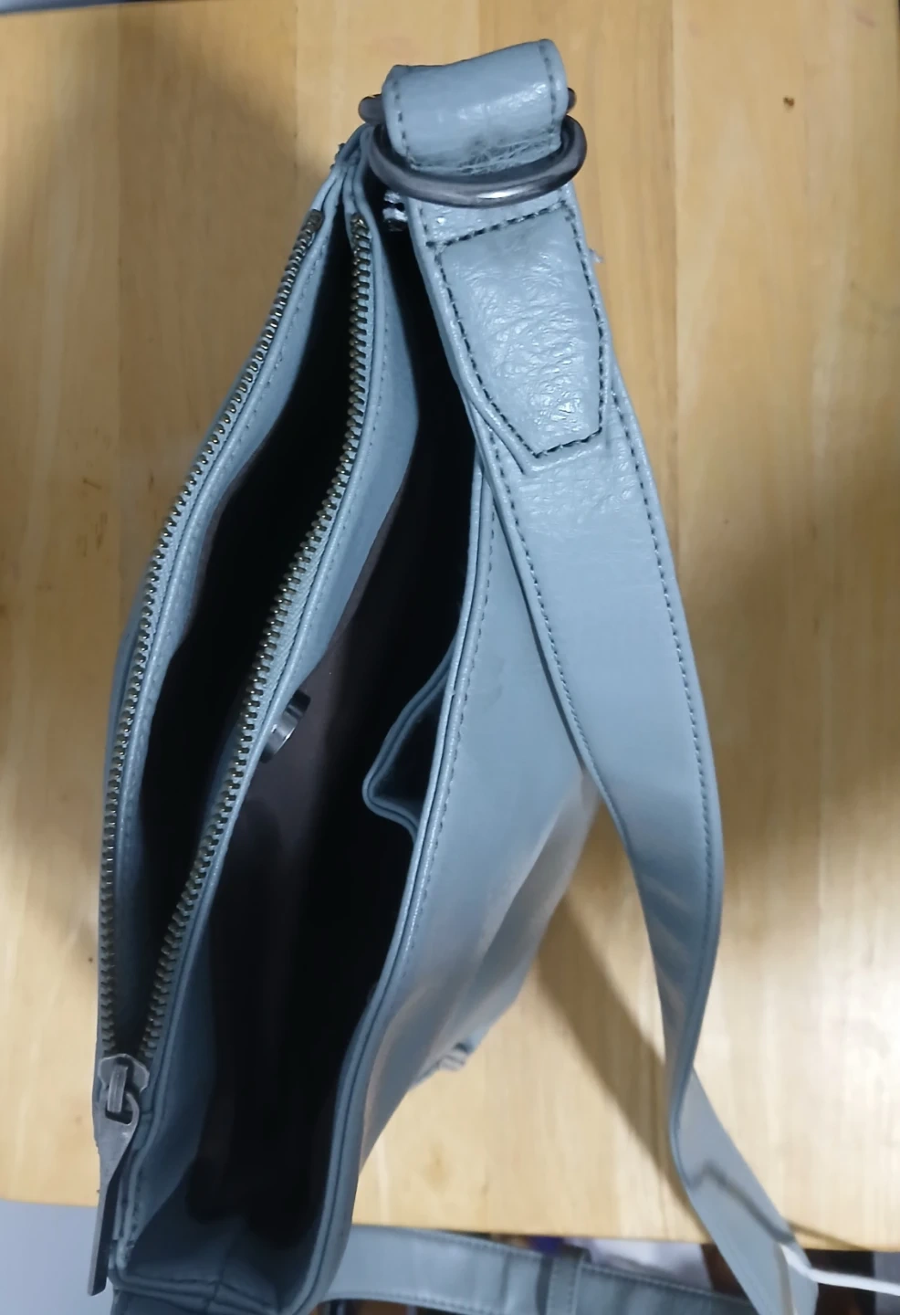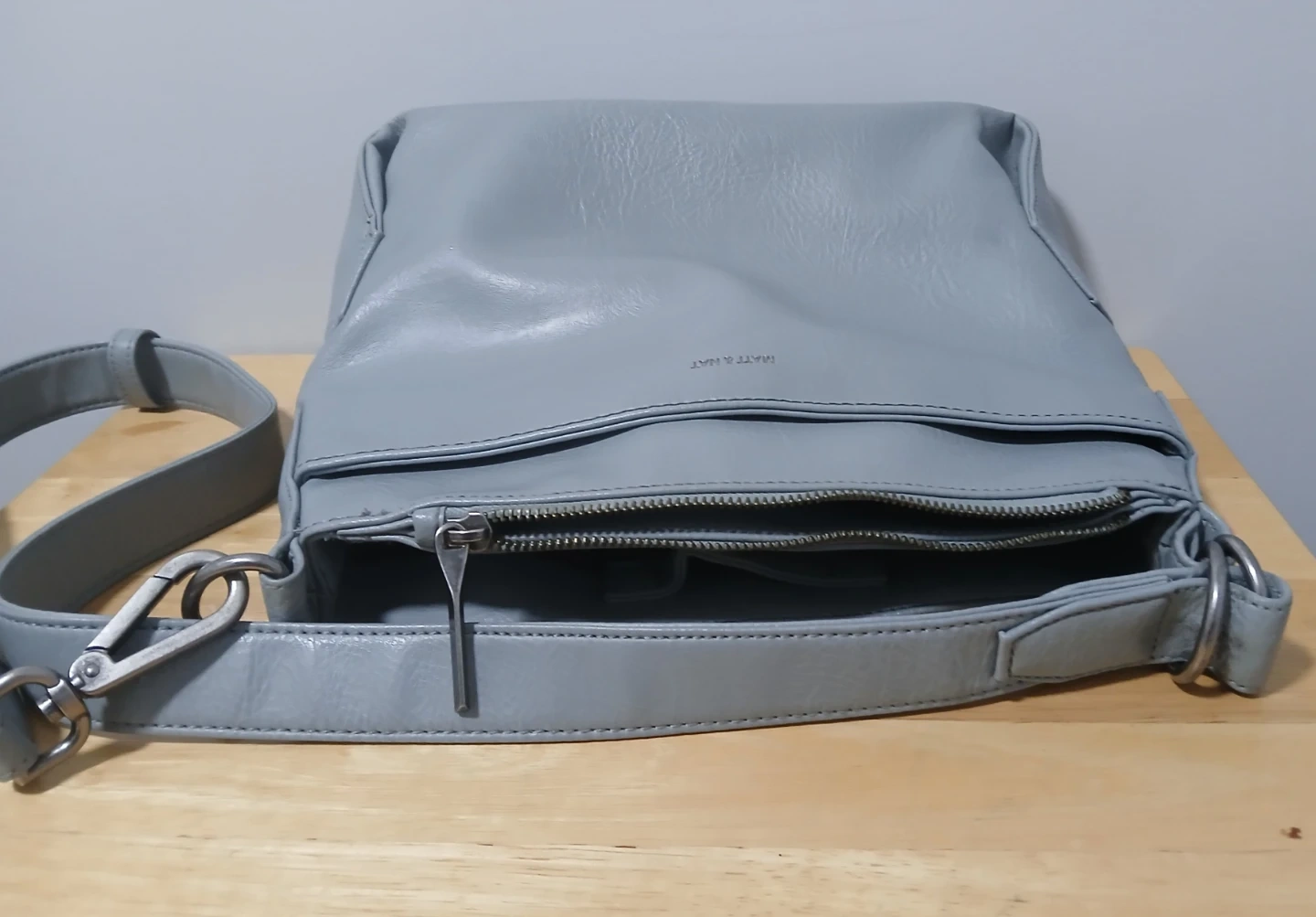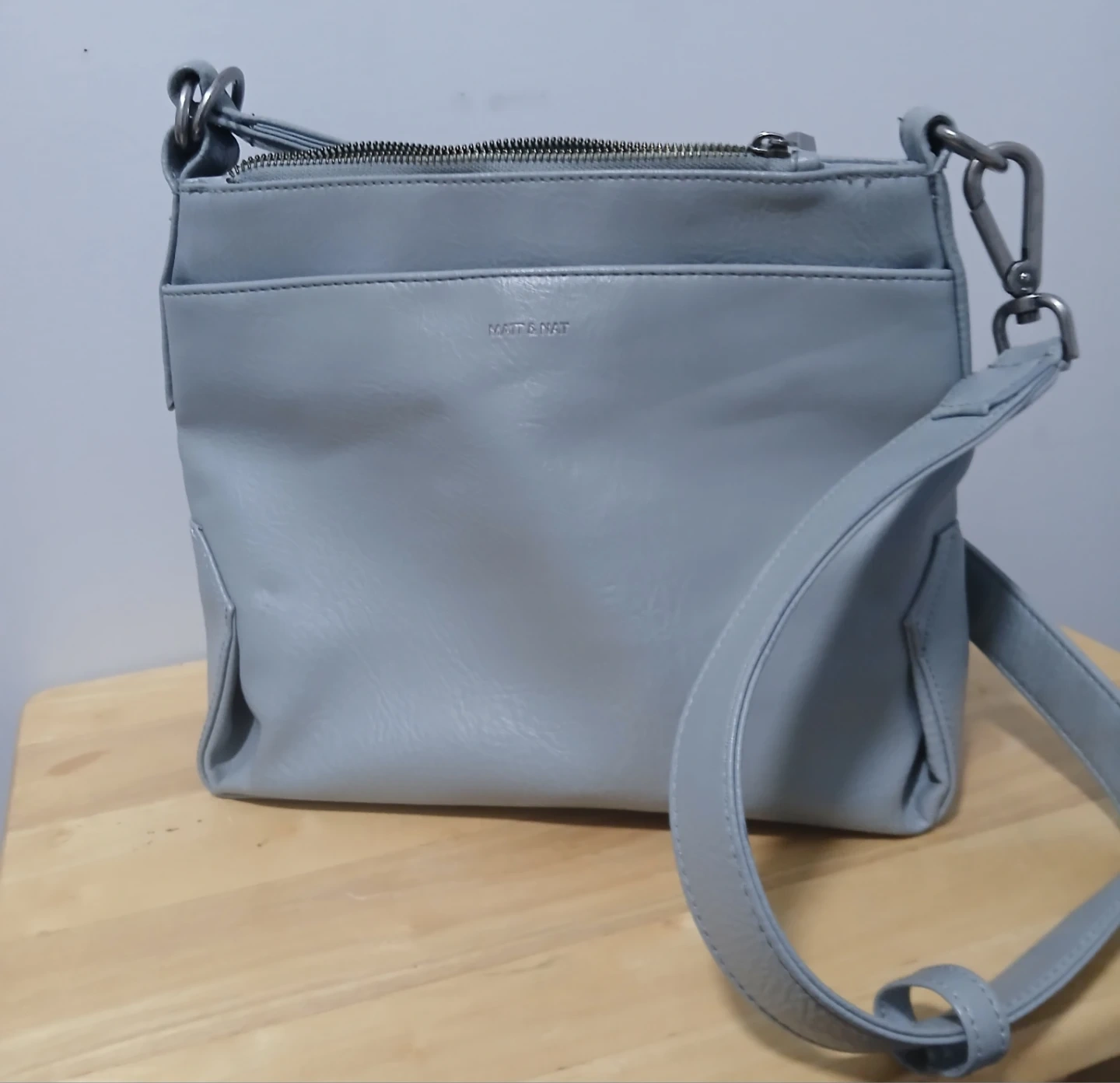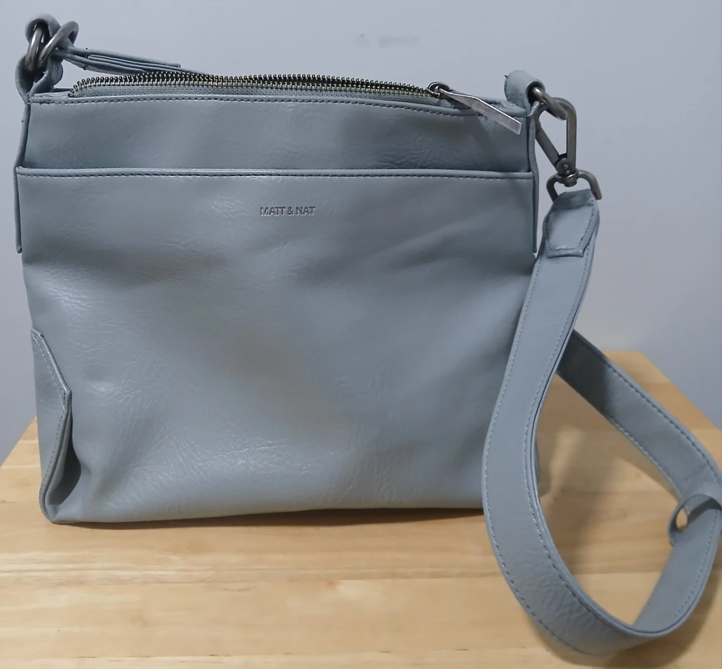 This is a Matt & Nat crossbody bag in a light grey colour. It's made of faux leather and has a zippered main compartment. Bag's dimensions are approximately 10" wide and 8" tall.