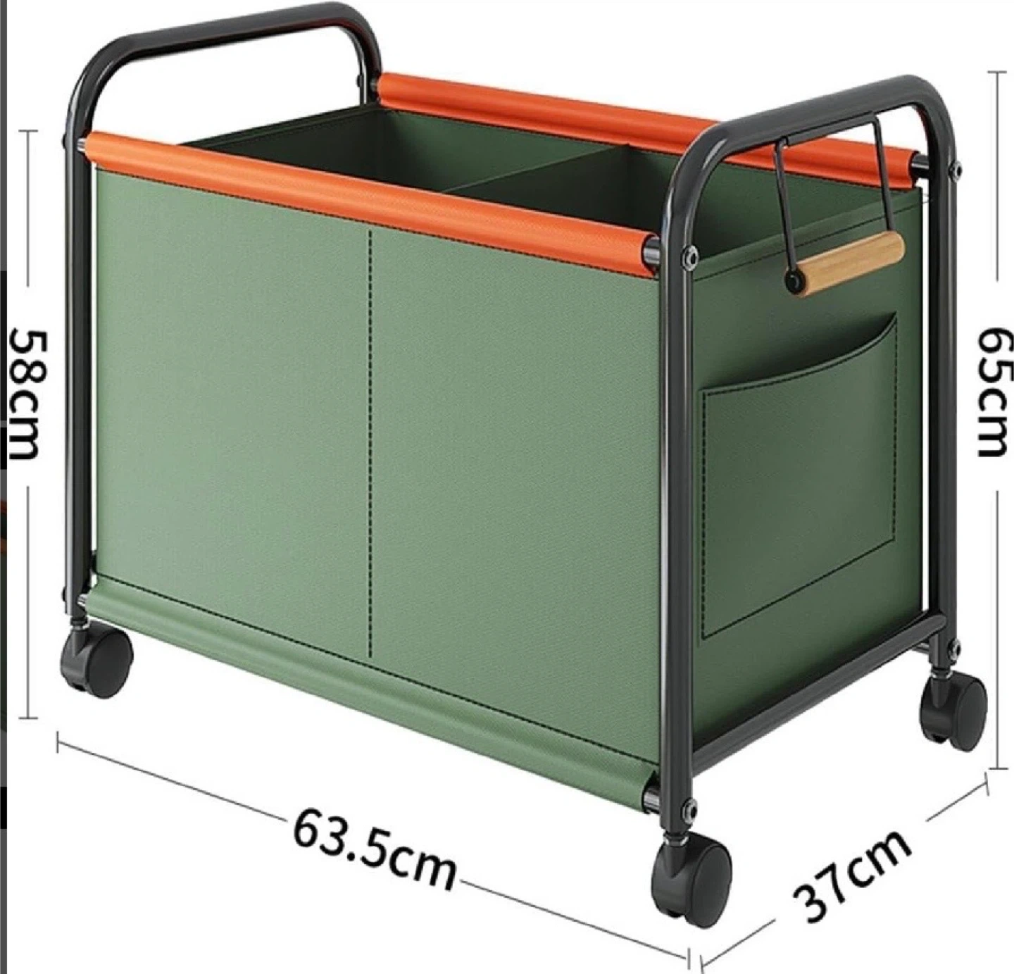 This toy storage cart is made with a durable metal frame and fabric bins. It's divided into two compartments and features a side pocket for extra storage. The cart includes four wheels for easy mobility, making it a handy solution for organizing toys. Dimensions: 63.5cm x 37cm x 65cm.