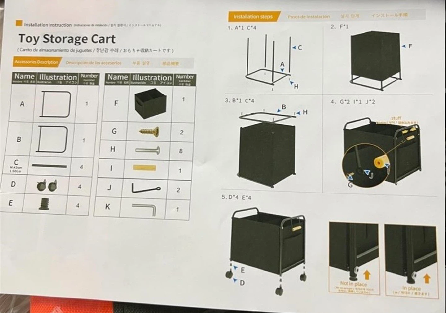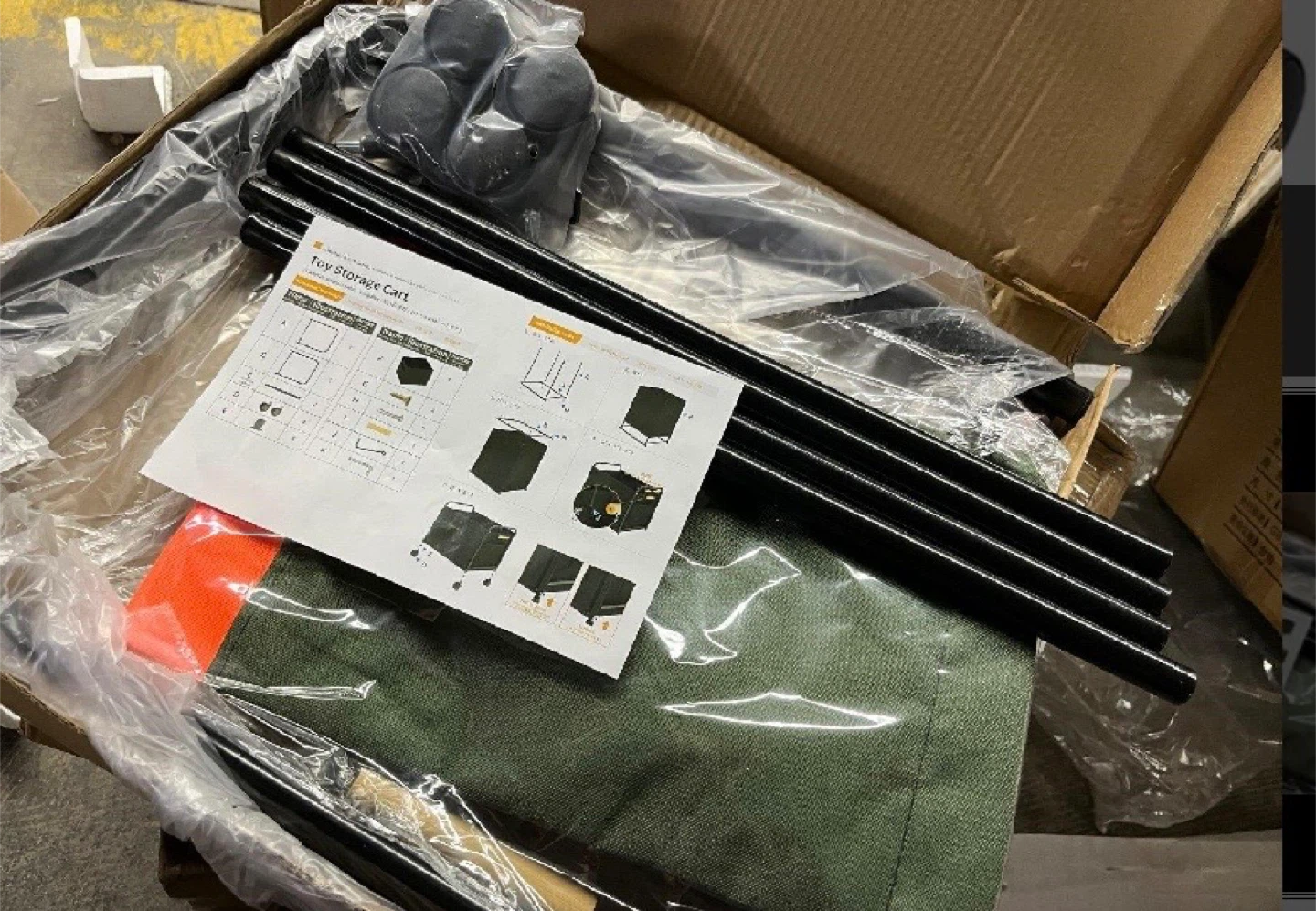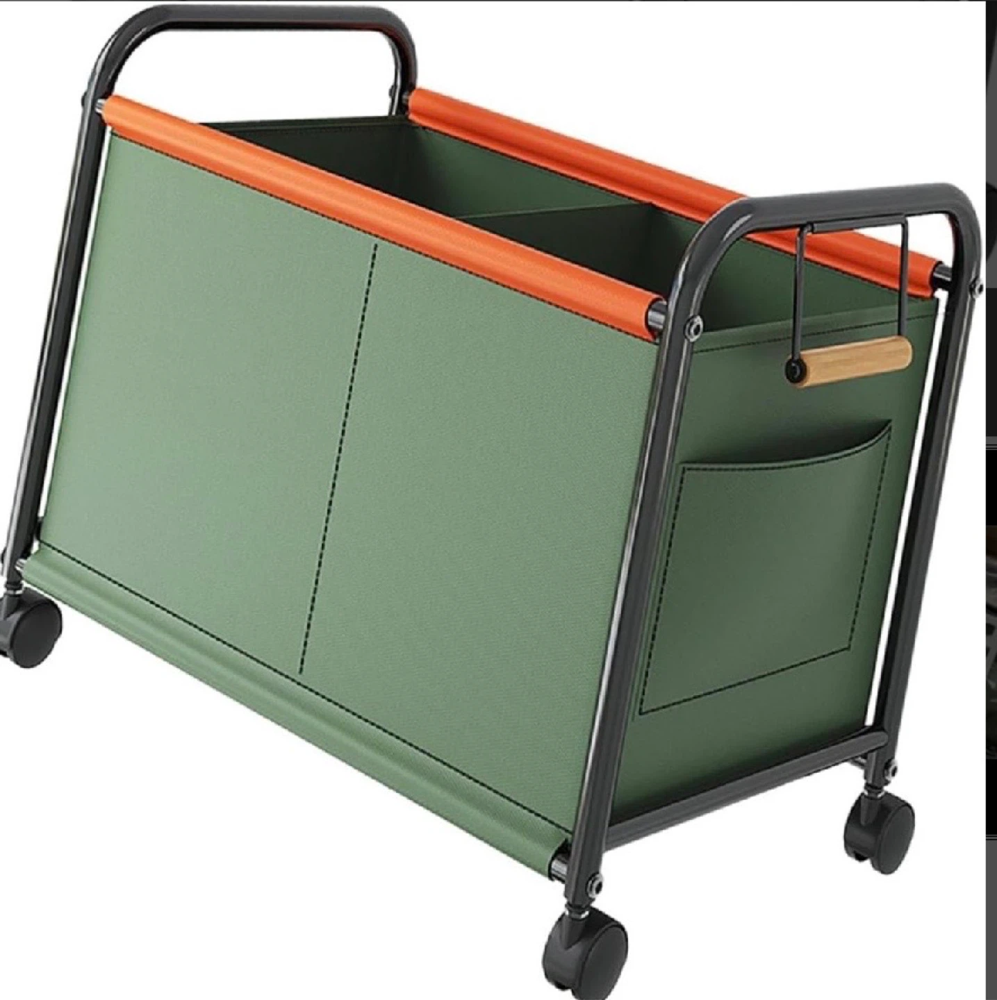 This toy storage cart is made with a durable metal frame and fabric bins. It's divided into two compartments and features a side pocket for extra storage. The cart includes four wheels for easy mobility, making it a handy solution for organizing toys. Dimensions: 63.5cm x 37cm x 65cm.