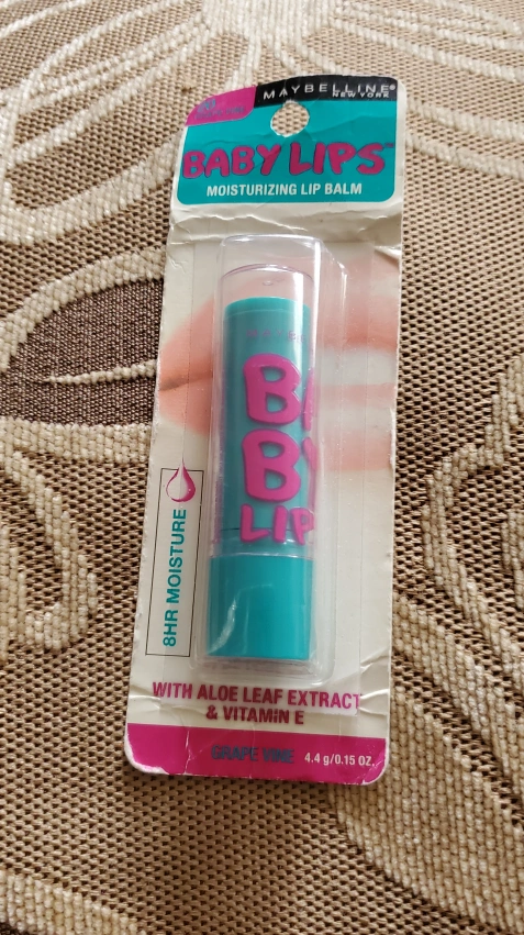New Maybelline Baby Lips lip balm. Grape Vine flavor. Moisturizing formula with aloe leaf extract and vitamin E. 8-hour moisture.