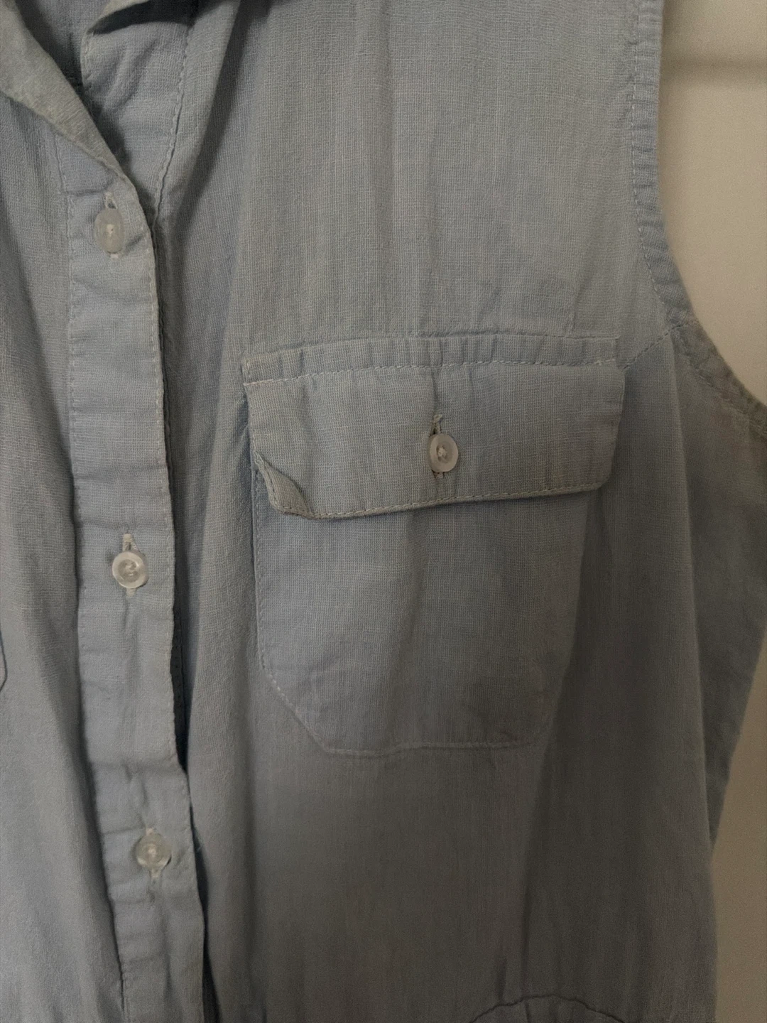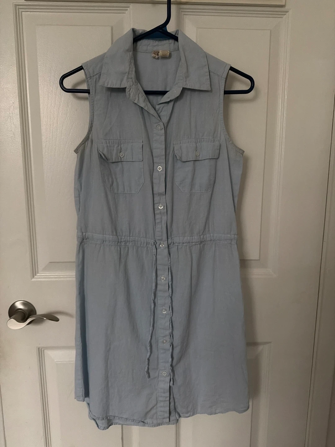 Light blue sleeveless shirt dress. It features a button-up front and two chest pockets. Features a drawstring waist for adjustable fit.