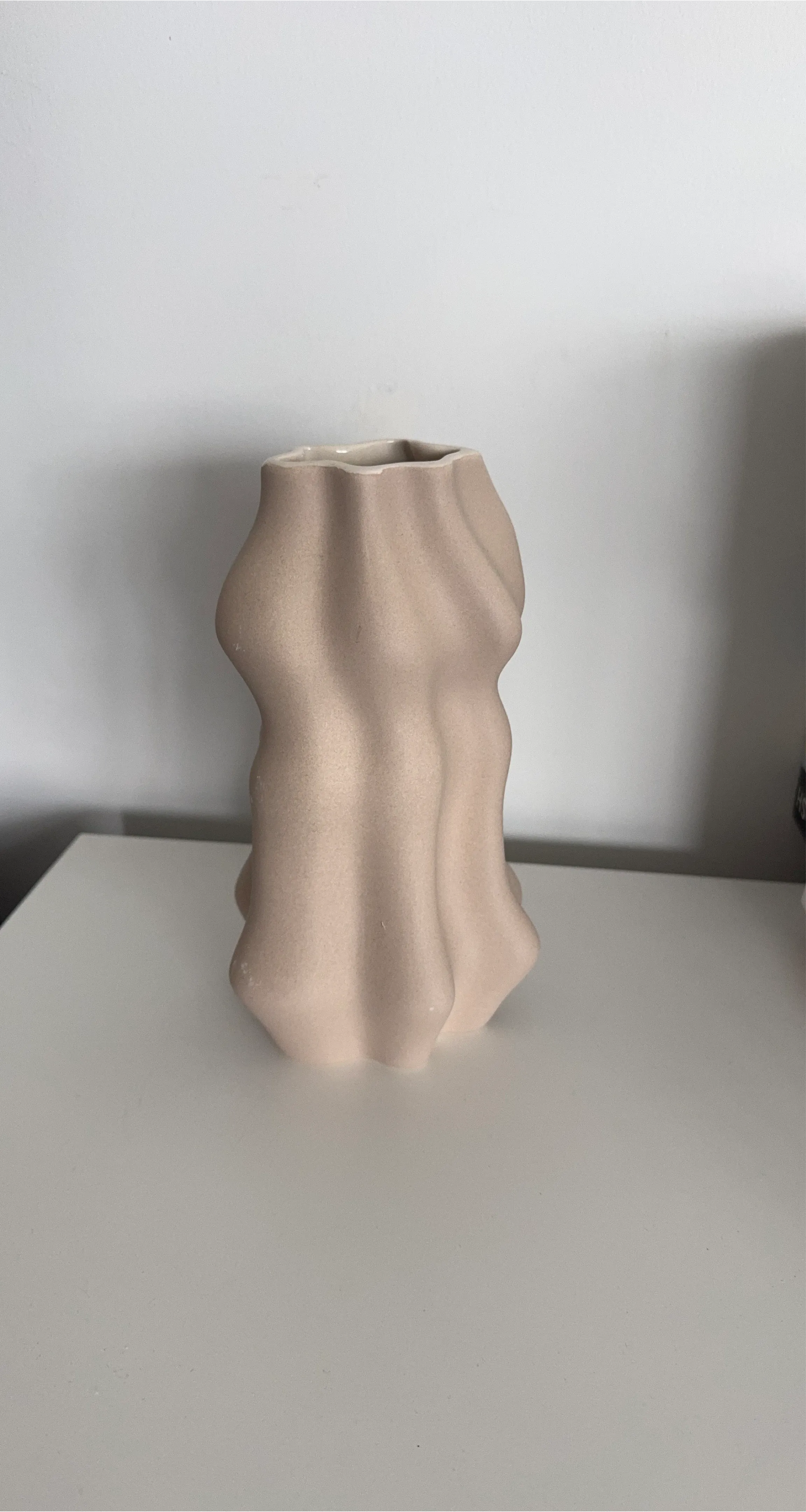 This decorative ceramic vase has a unique wavy texture and a light beige matte finish. It's a lovely piece for holding dried flowers or as standalone decor. Ceramic material.