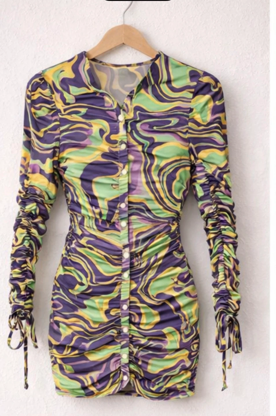 This SHEIN shirt dress features a bold swirly pattern and ruching detail. It has long, ruched sleeves with tie cuffs. The dress is button-down and made in China. Size medium.