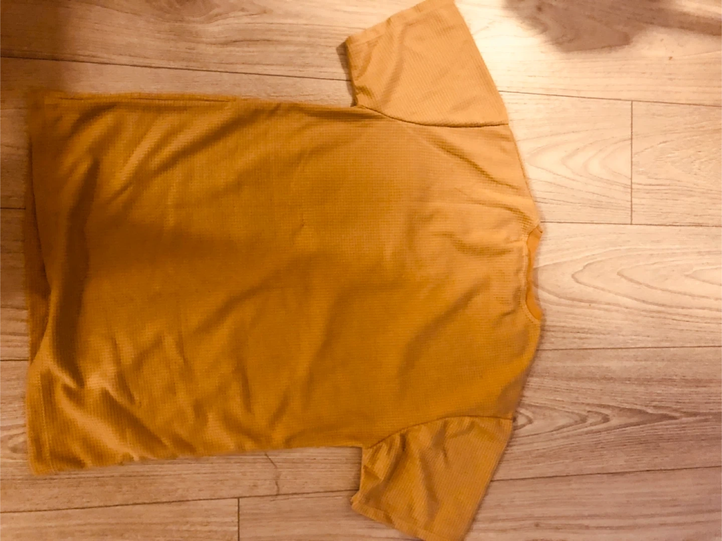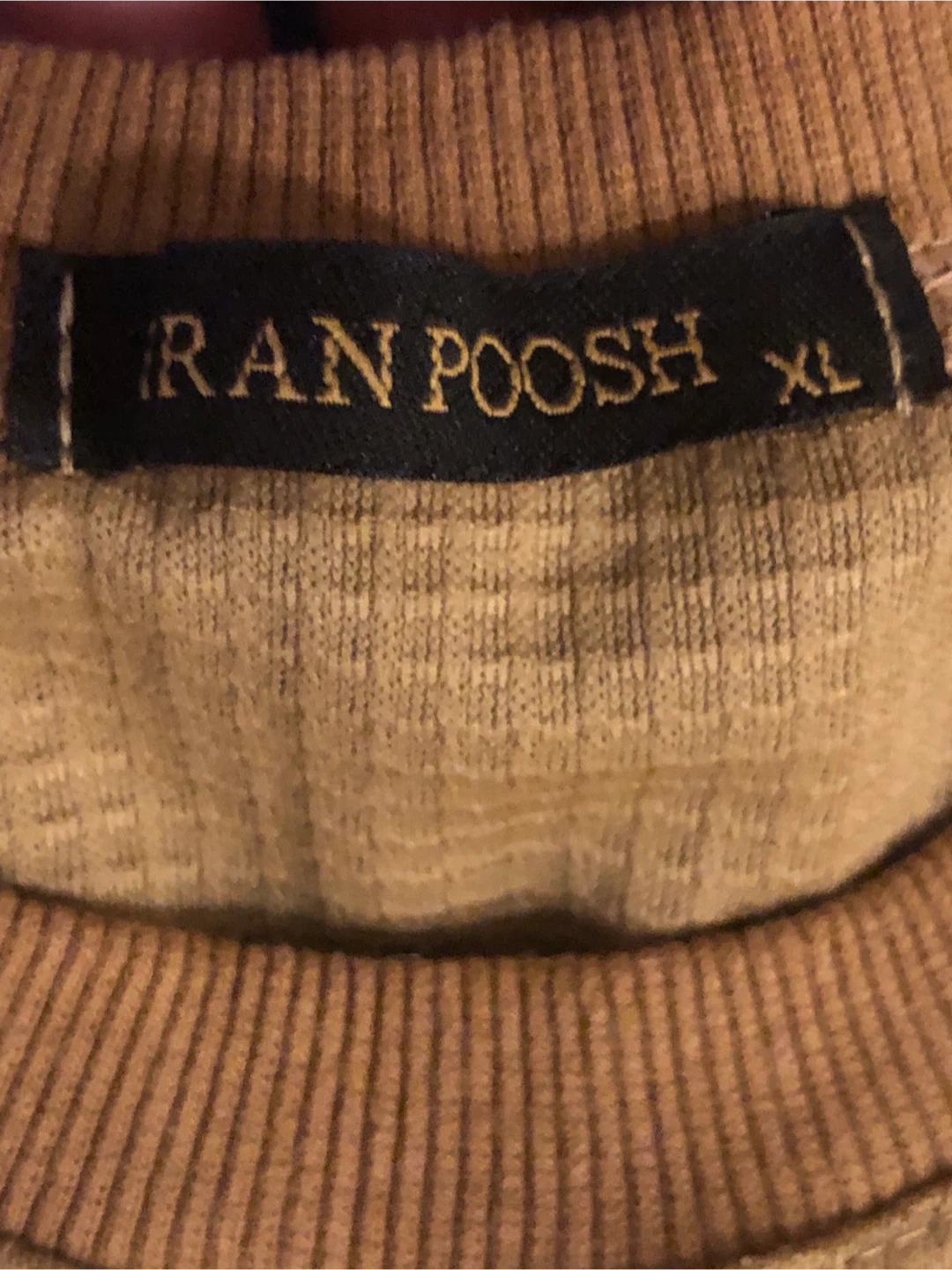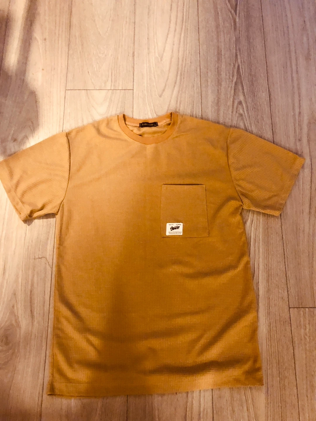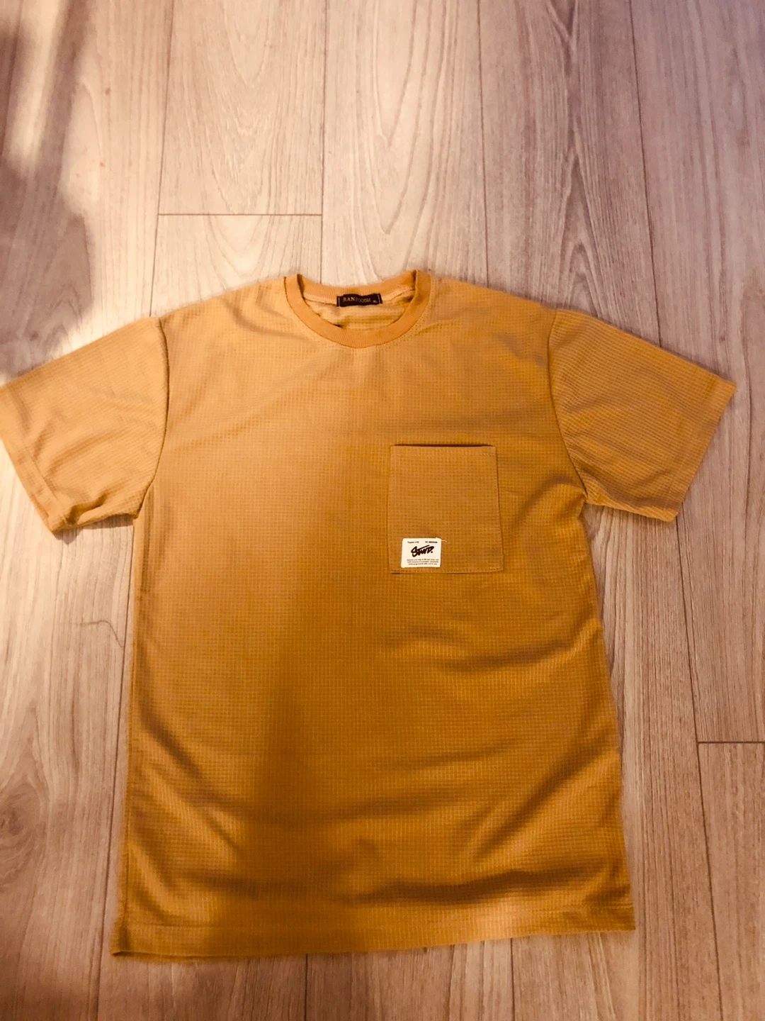 This is a Pull&Bear Streetwear IRAN POOSH t-shirt in XL. It's a mustard yellow colour with a chest pocket. The fabric has a subtle textured pattern. Size XL
