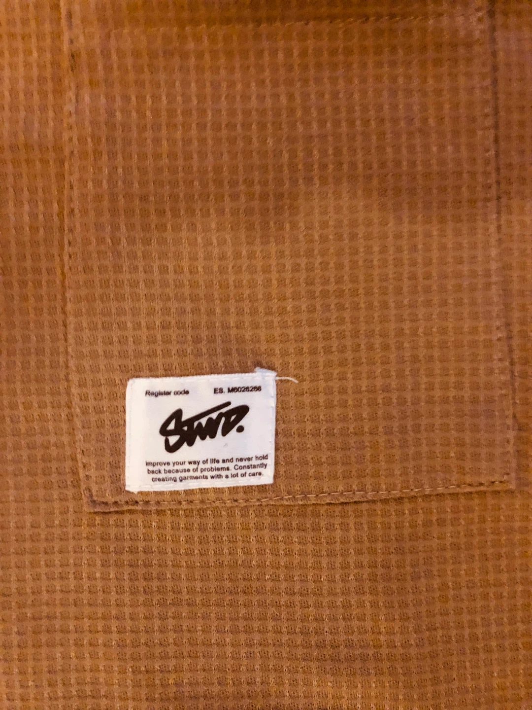 This is a Pull&Bear Streetwear IRAN POOSH t-shirt in XL. It's a mustard yellow colour with a chest pocket. The fabric has a subtle textured pattern. Size XL