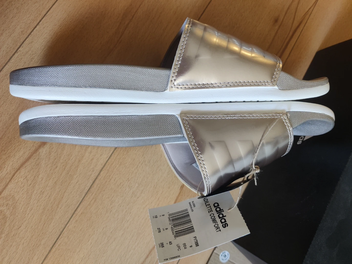 Adidas Adilette Comfort slides in a silver gold and silver colourway. Includes original box and tags. Comfortable and casual, these slides are great for everyday wear or post-workout relaxation.