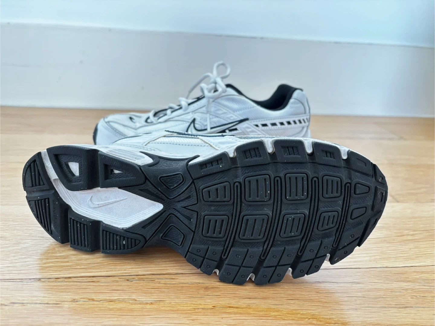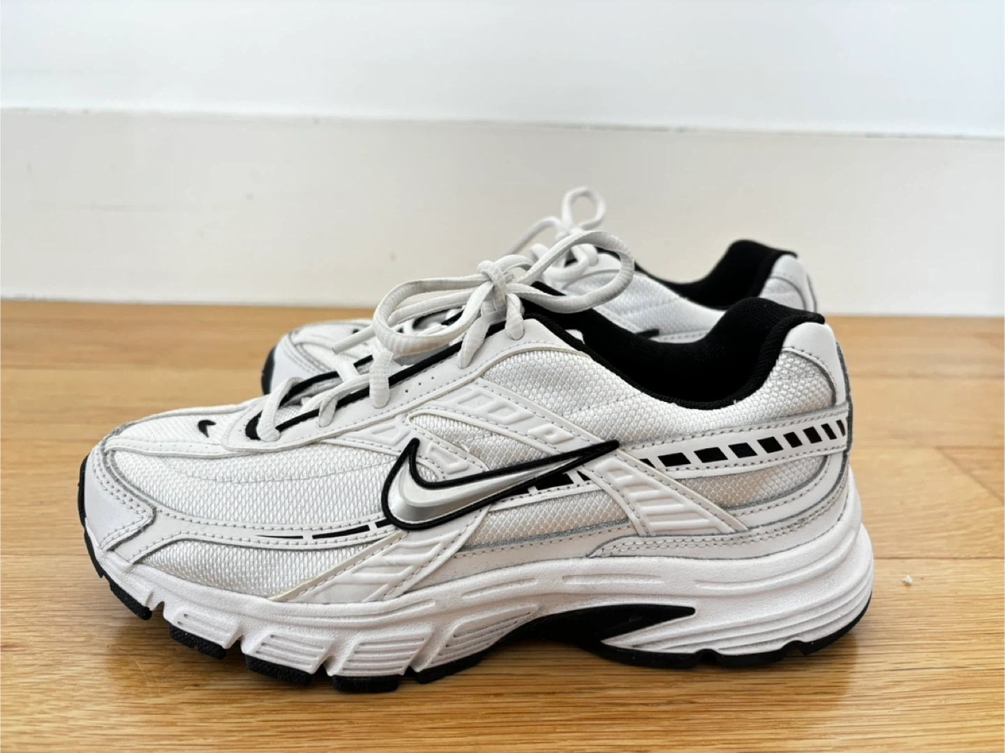 White Nike running shoes. Women's US size 7 (I am 6.5 and fit perfectly). These shoes are designed for comfort and performance. Features a breathable mesh upper and a durable rubber outsole for traction.