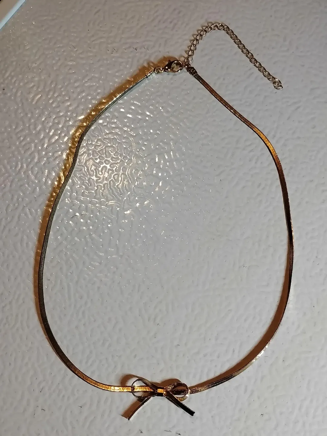 A delicate gold tone herringbone necklace featuring a charming bow accent. It has an adjustable chain for a comfortable fit. This necklace is a lovely addition to any outfit!