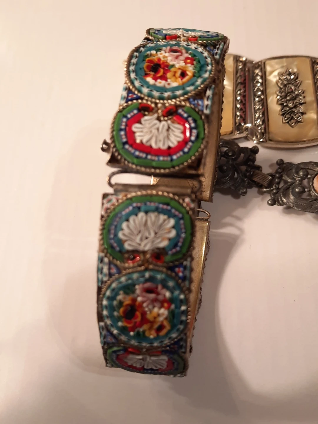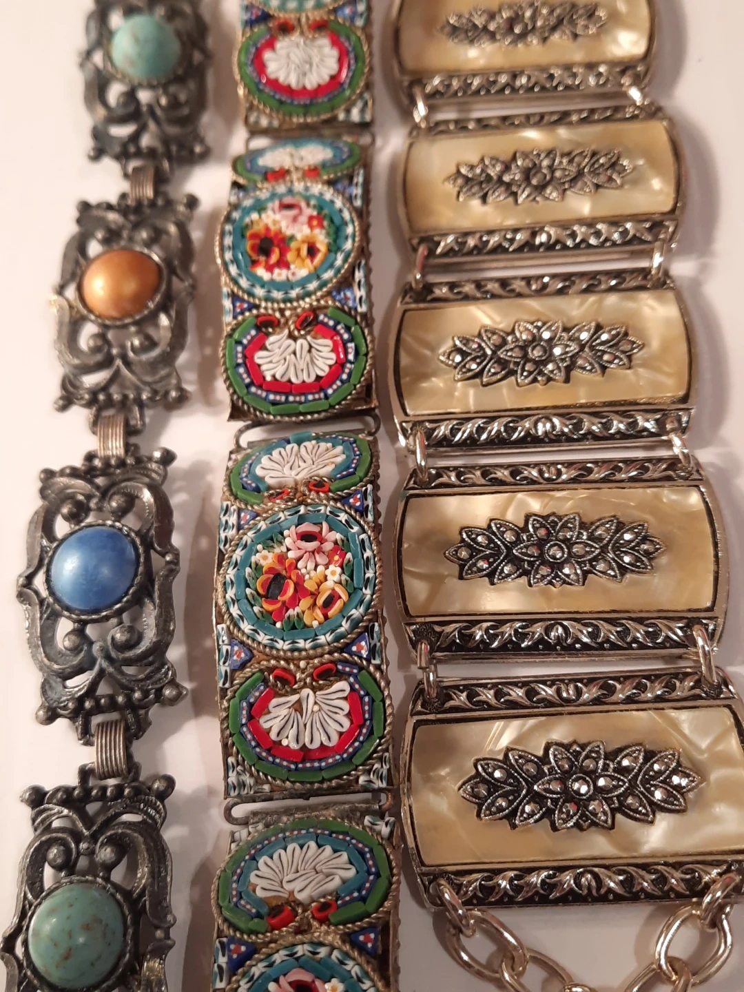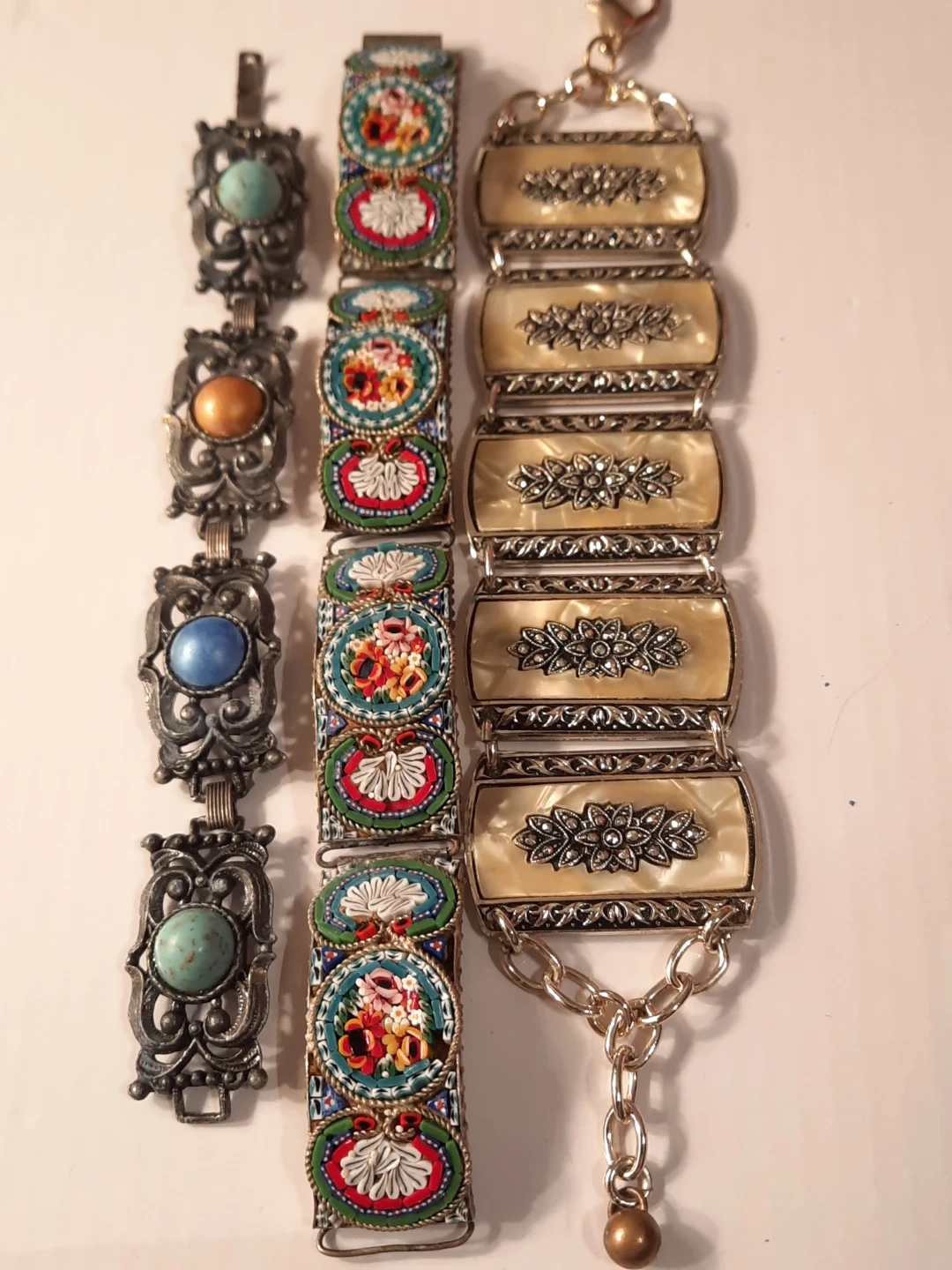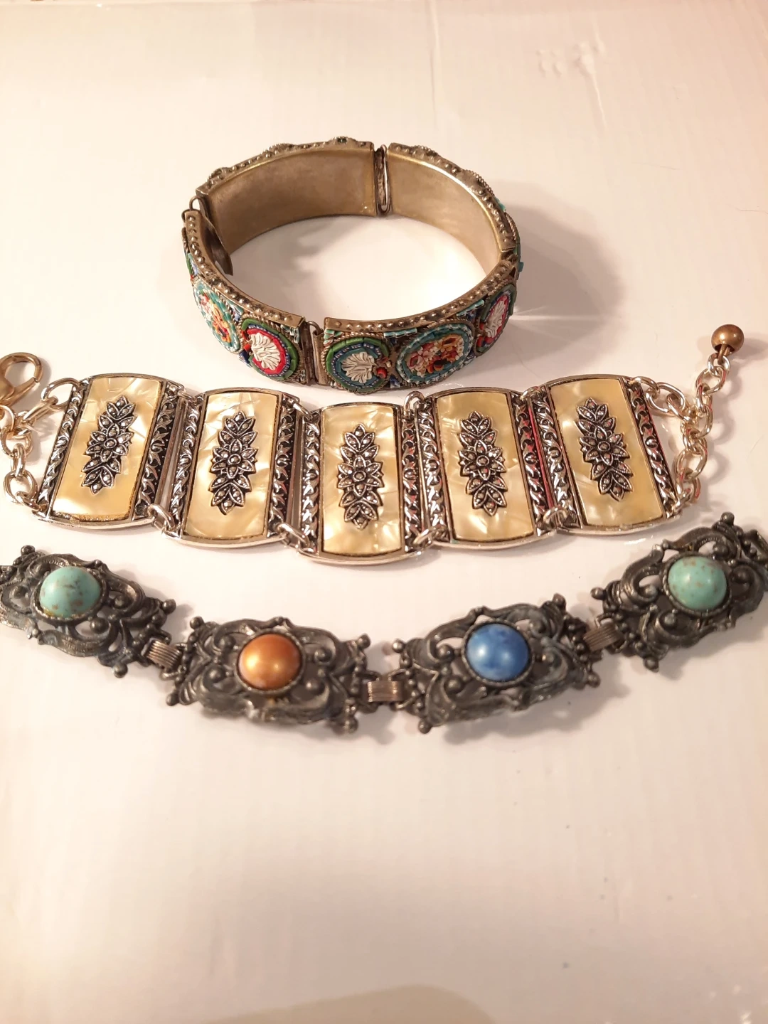 This lot includes three vintage bracelets. Two feature intricate mosaic designs with floral patterns, and one has decorative faux mother-of-pearl panels with floral carvings. These pieces add a unique touch to any jewellery collection!