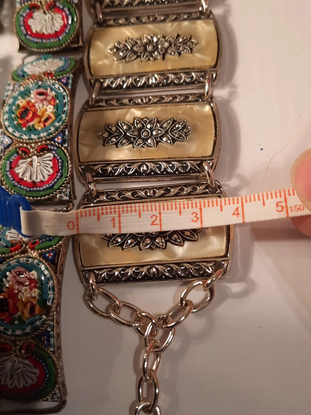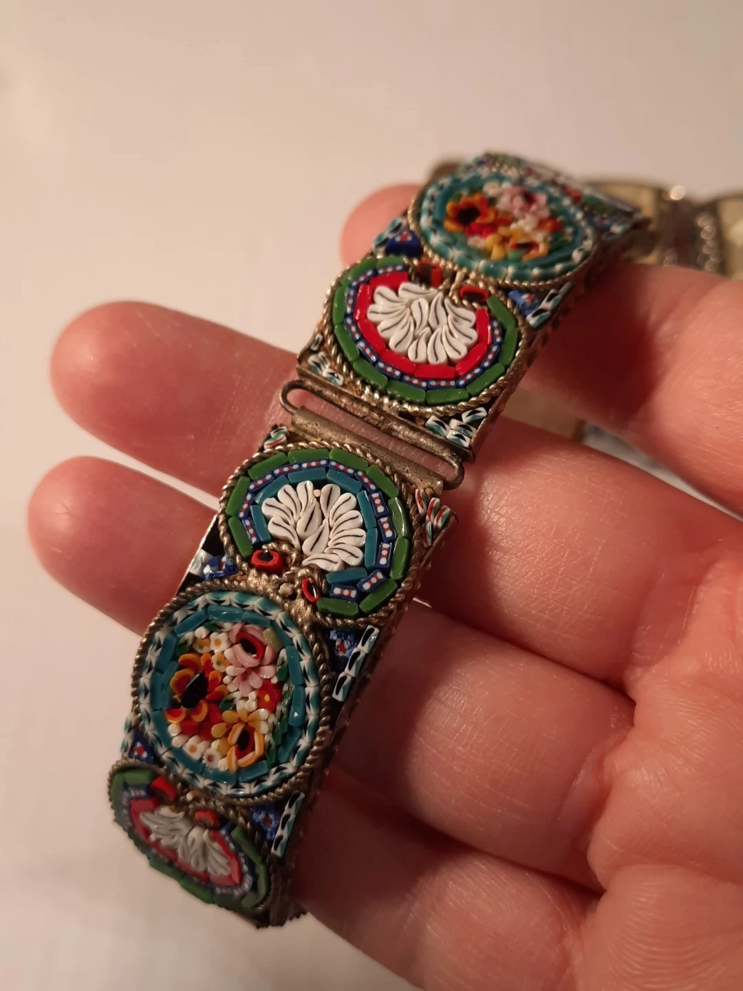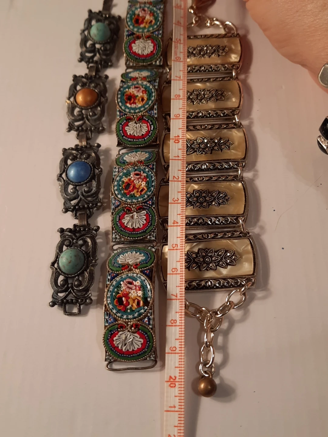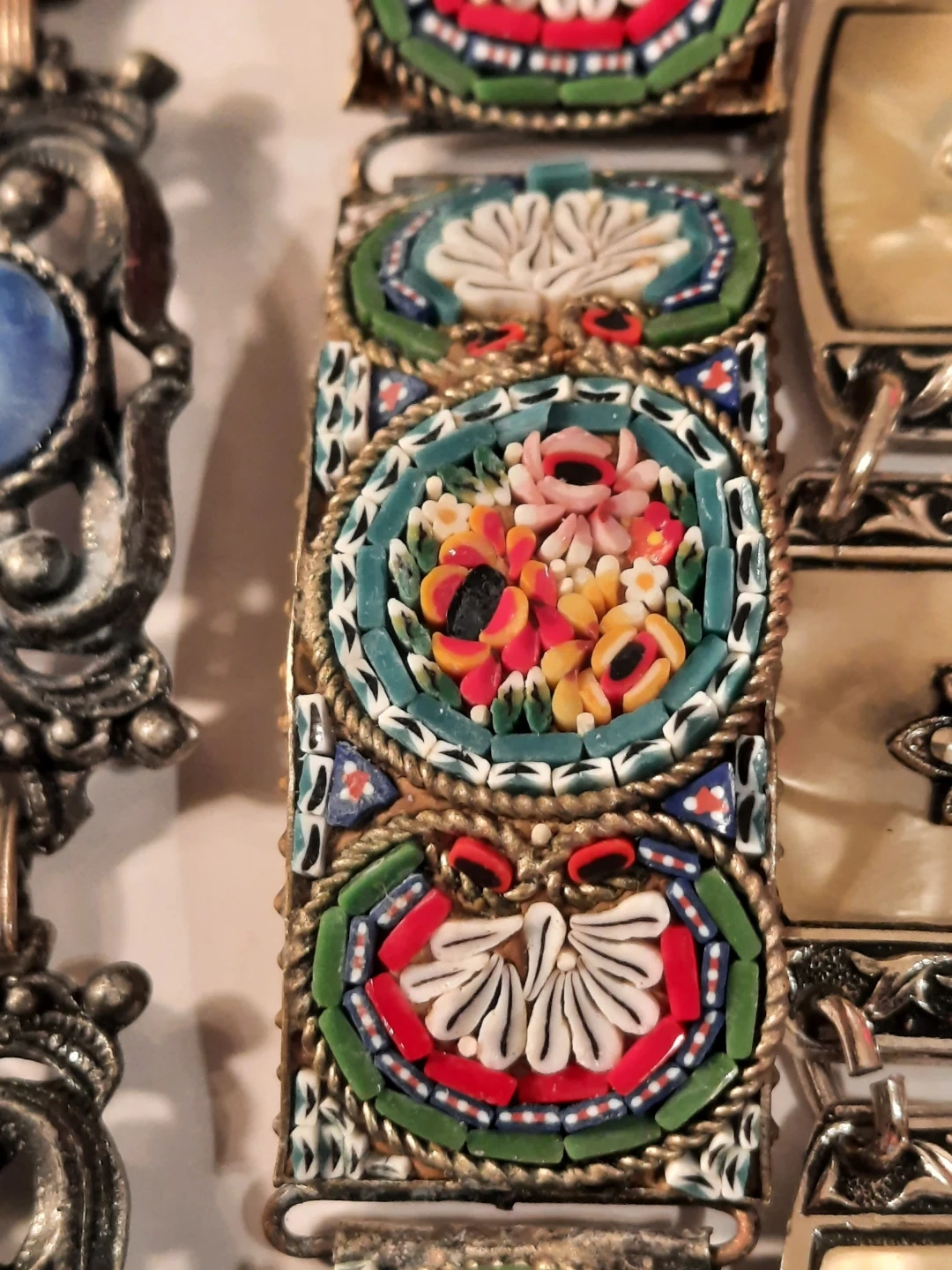 This lot includes three vintage bracelets. Two feature intricate mosaic designs with floral patterns, and one has decorative faux mother-of-pearl panels with floral carvings. These pieces add a unique touch to any jewellery collection!