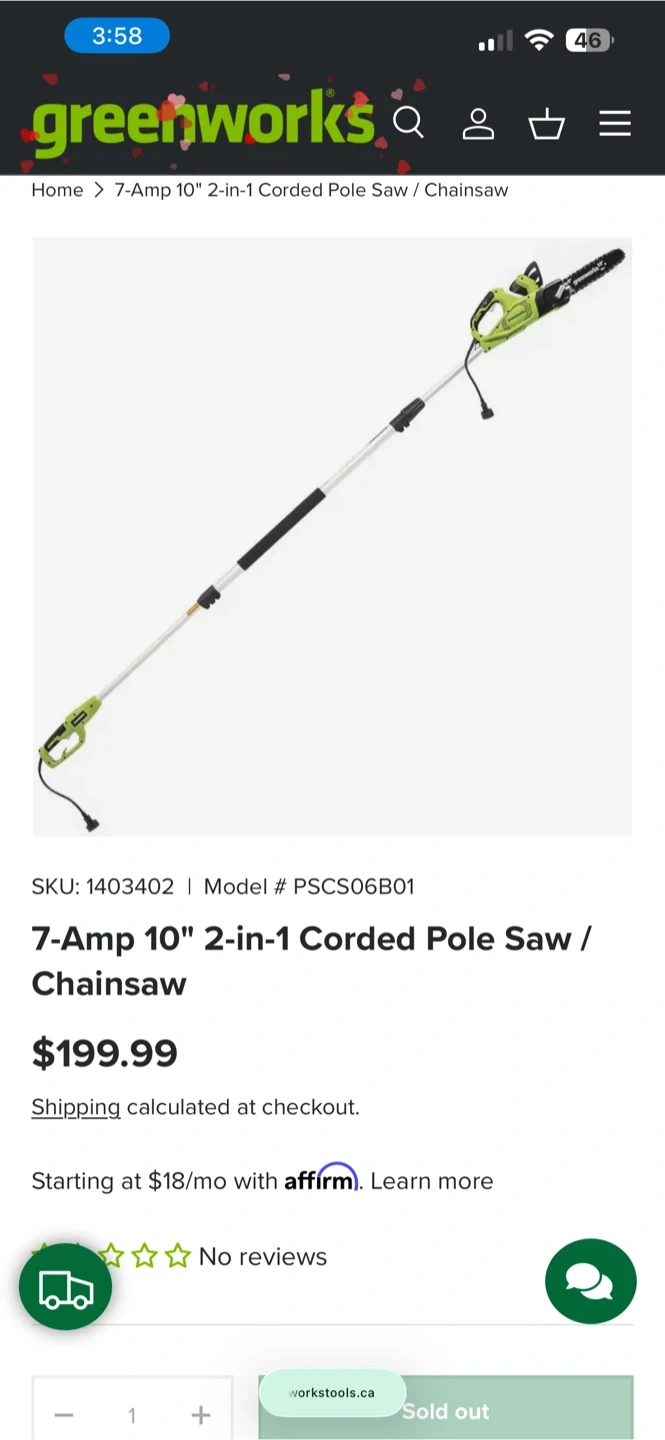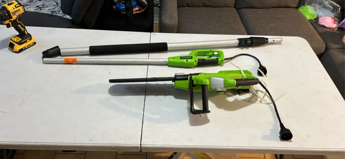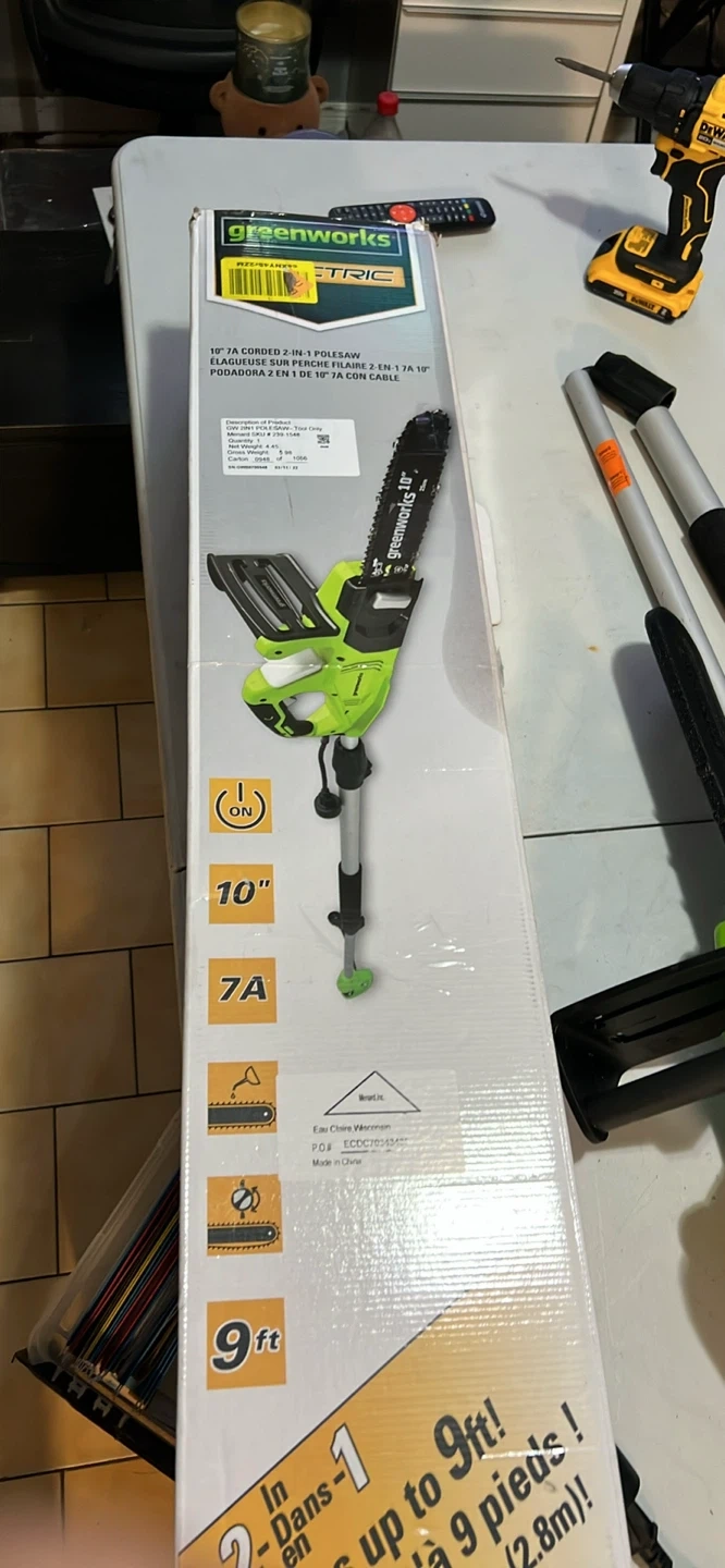 Buy & SellGreenworks 7-Amp 10" Corded 2-in-1 Pole Saw / ChainsawGreenworks 7-Amp 10" Corded 2-in-1 Pole Saw / Chainsaw$110This Greenworks 2-in-1 corded pole saw is a 7-Amp unit with a 10-inch bar. It extends up to 9 feet. It's great for trimming branches overhead.ConditionNewWHERE TO MEETShopper drug martView MapSELLERverifiedFrostyRogers Road820 reviews0 chats·0 favorites·5 viewsSEND CHAT TO SELLERHi Frosty! I’m interested in your listing.Hi Frosty! I’m interested in your listing.Get the Karrot app to chatSign In to chat