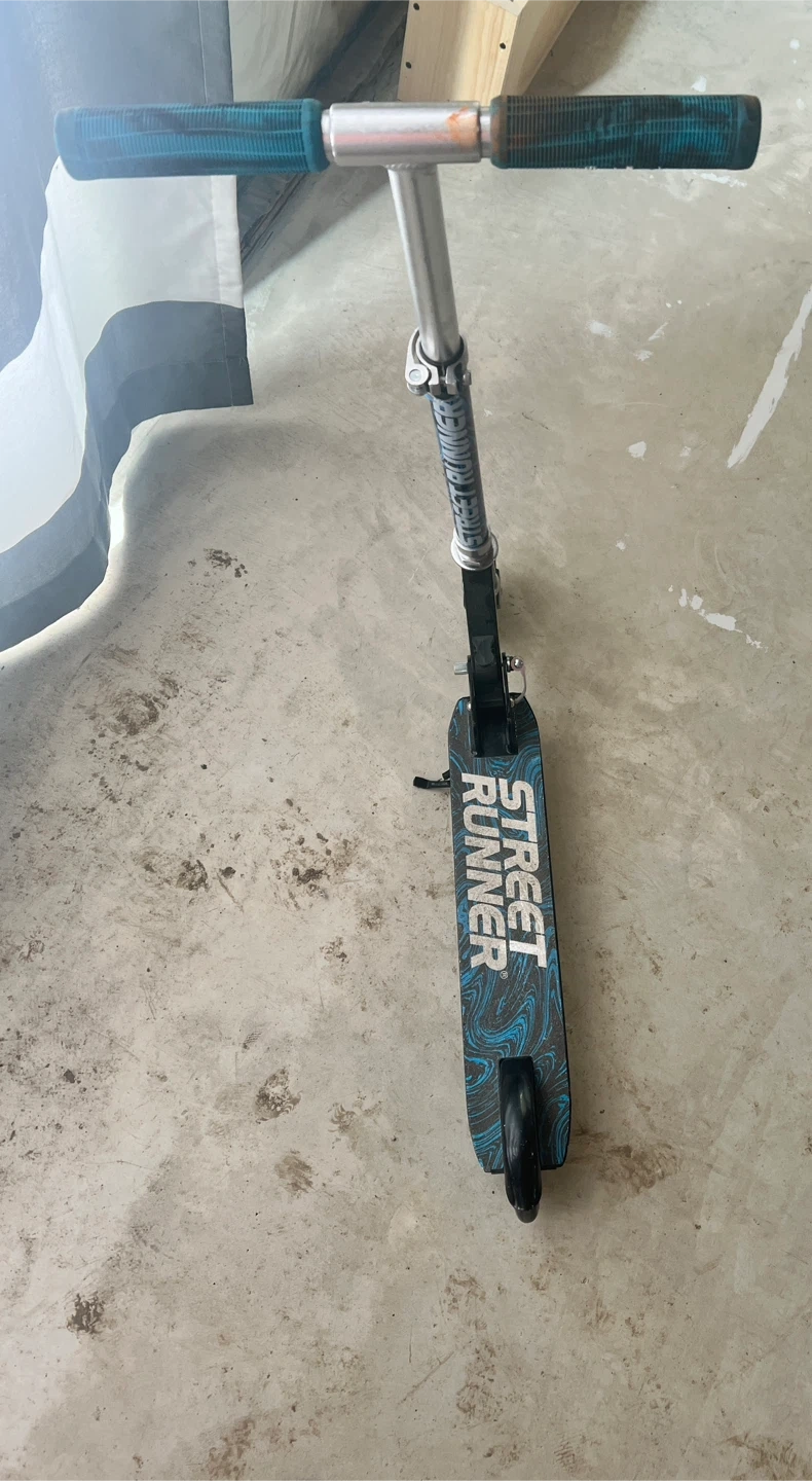 This is a kids scooter with "Street Runner" branding. It has blue and black swirl graphics on the deck and handlebars. Great for getting around outdoors!