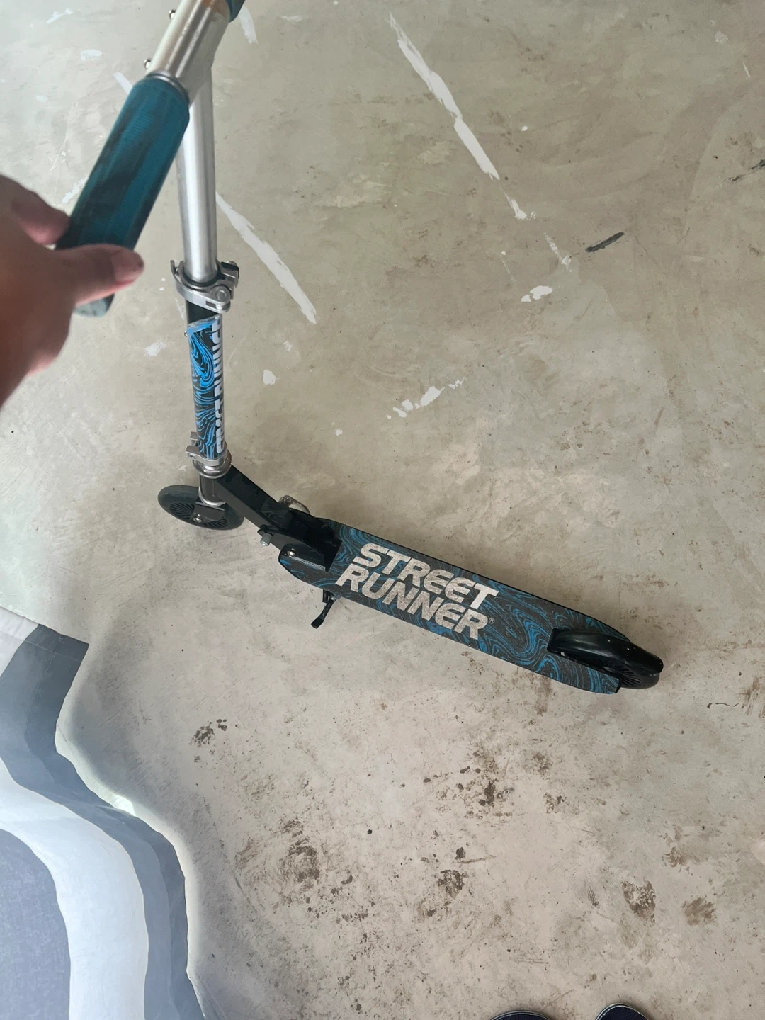 This is a kids scooter with "Street Runner" branding. It has blue and black swirl graphics on the deck and handlebars. Great for getting around outdoors!