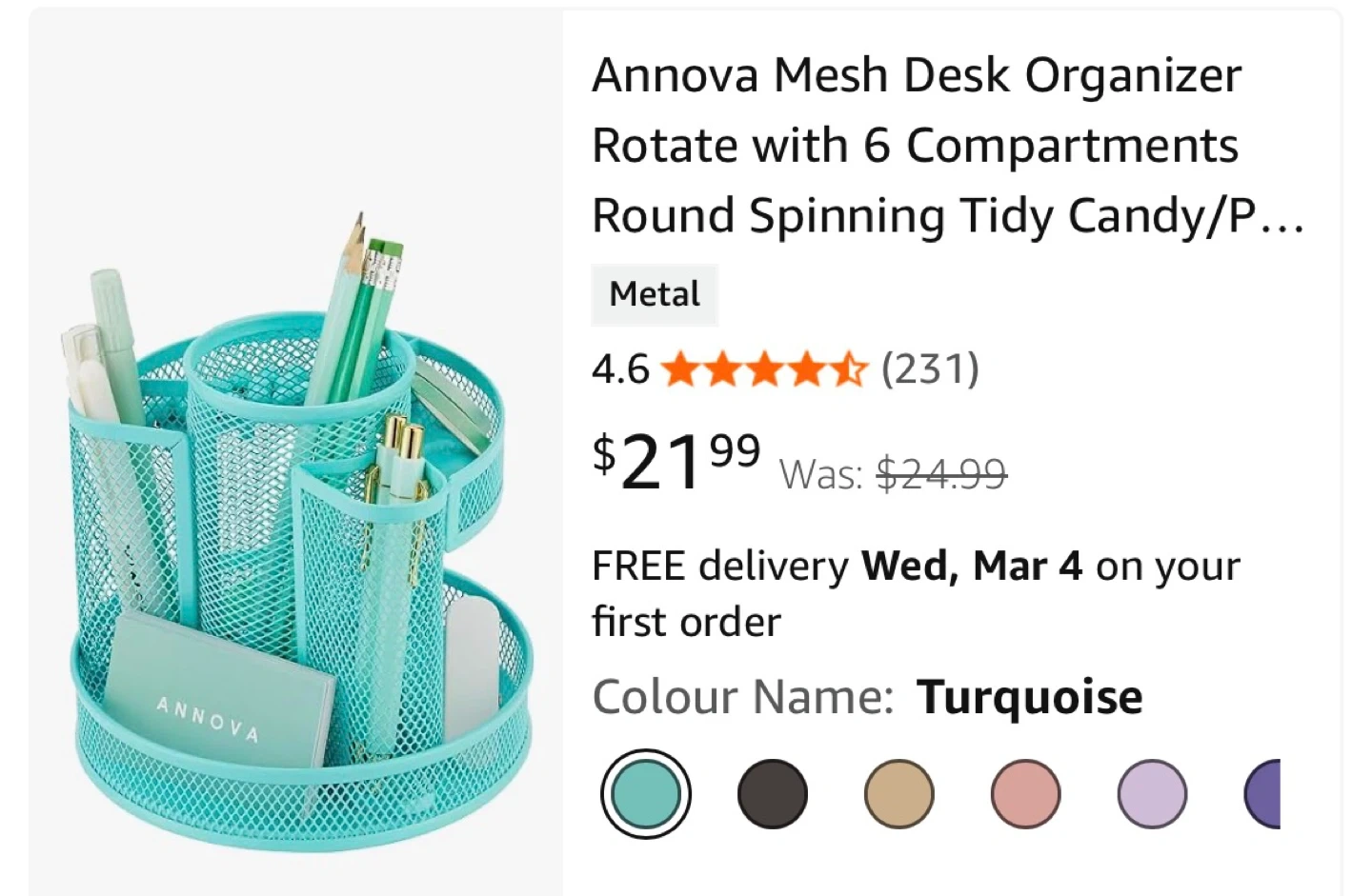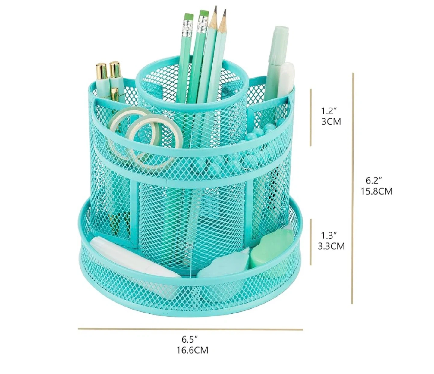 This desk organizer is made of metal and features a rotating base with six compartments. It's ideal for keeping pens, pencils, and other office supplies tidy. The turquoise colour adds a pop of brightness to any workspace.