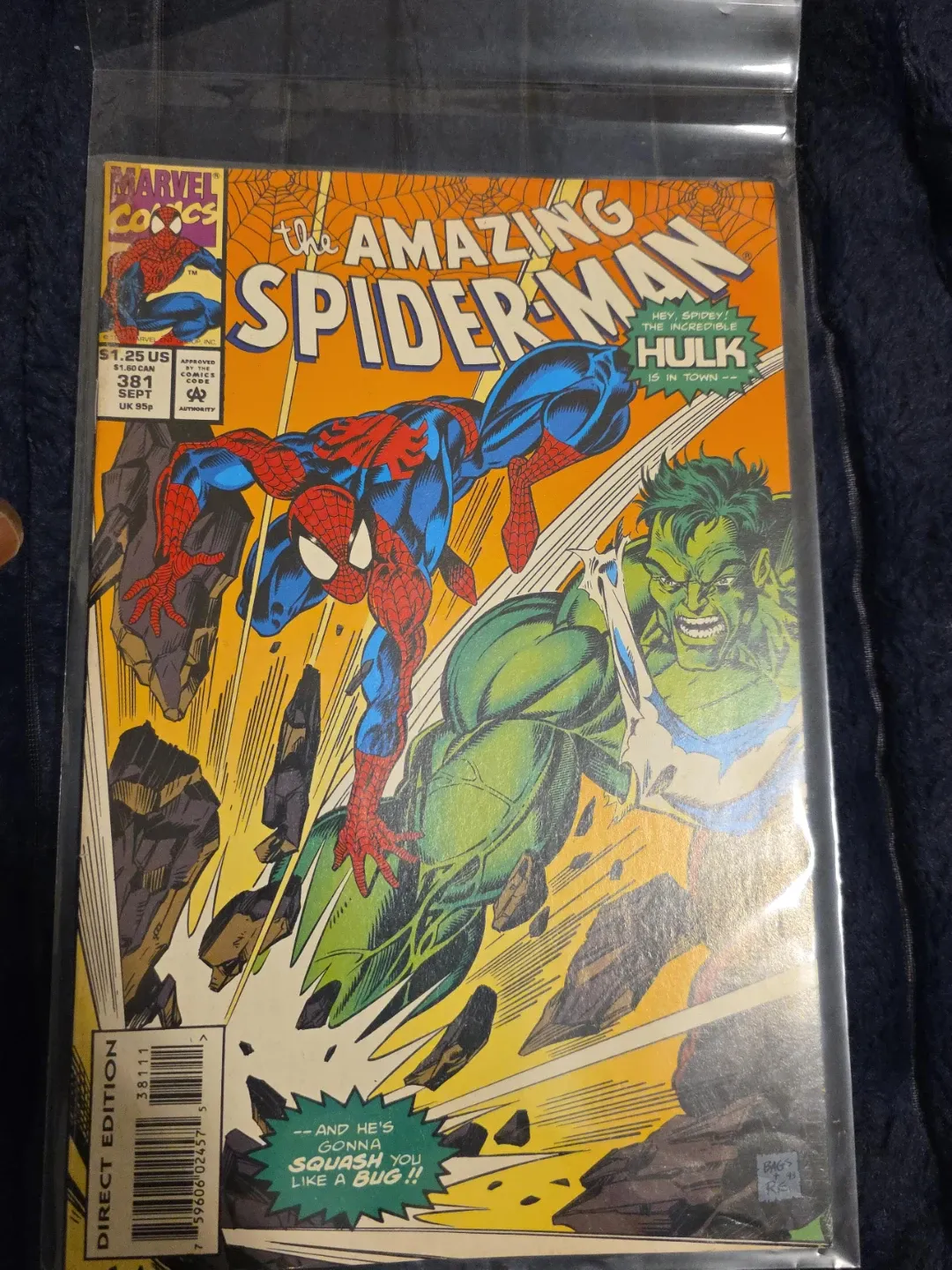 This is The Amazing Spider-Man comic book issue #381. It features Spider-Man and the Incredible Hulk. Published by Marvel Comics in September.