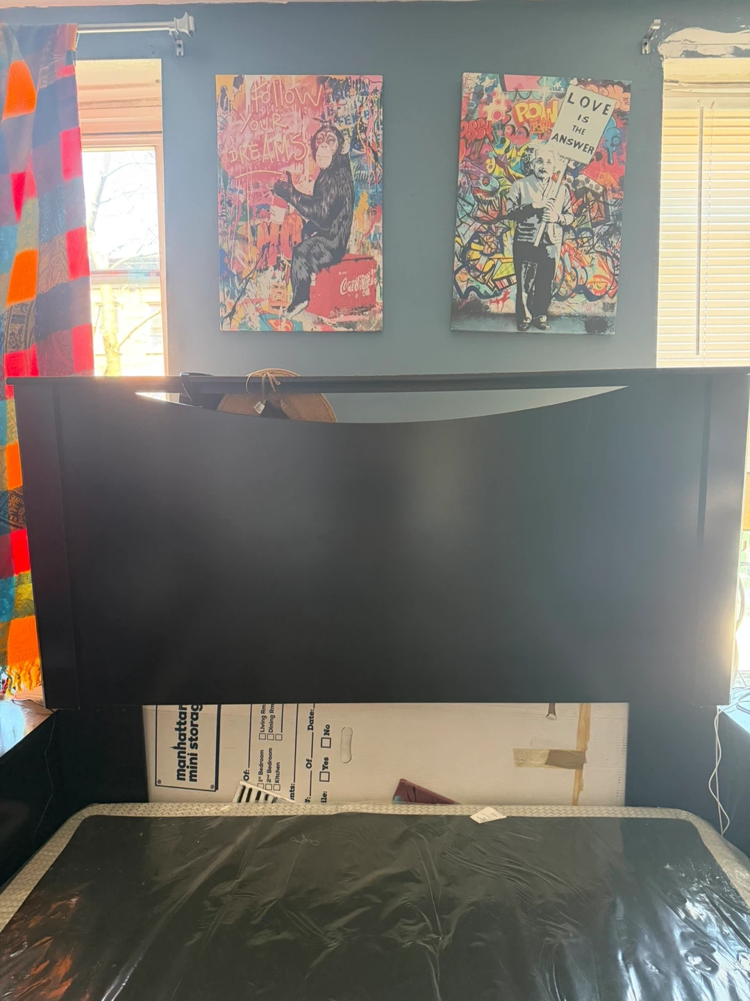 Dark brown queen size standard bed frame with headboard. Includes box spring for support. Easy to assemble/ disable. 60x 80