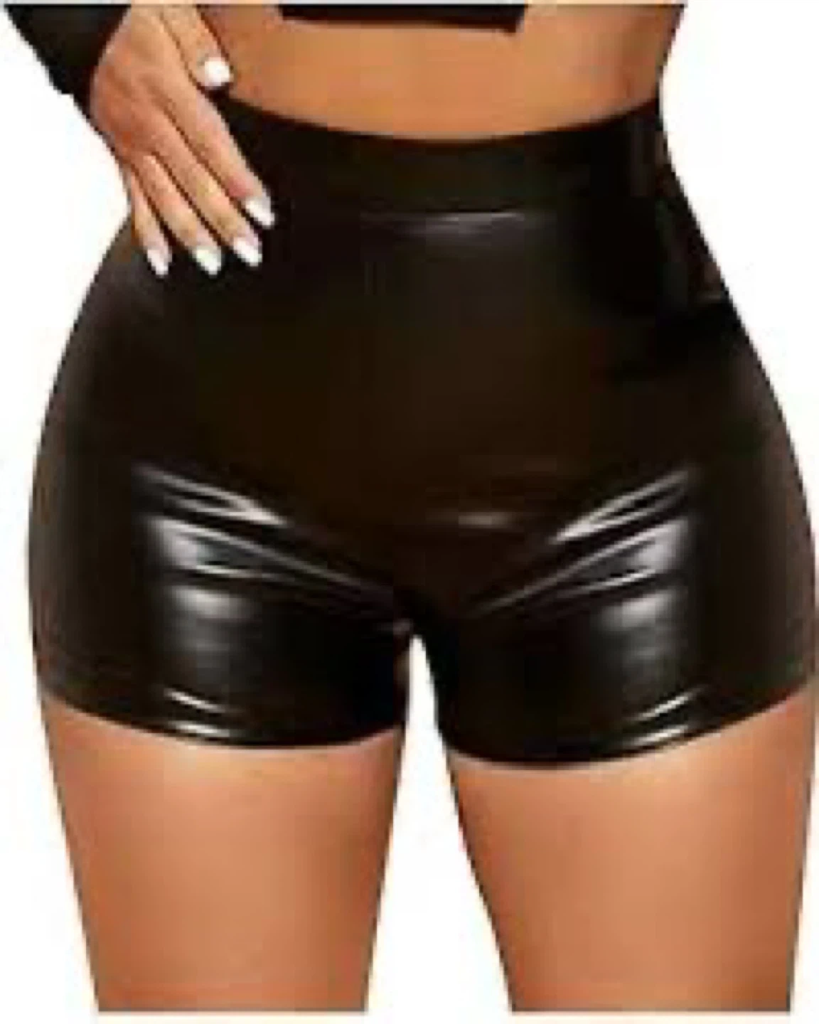 High-waisted faux leather shorts in black. These shorts are made from a shiny, stretchy material. They're perfect for a night out or dressing up an outfit.