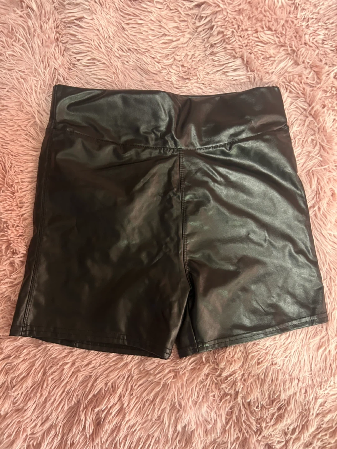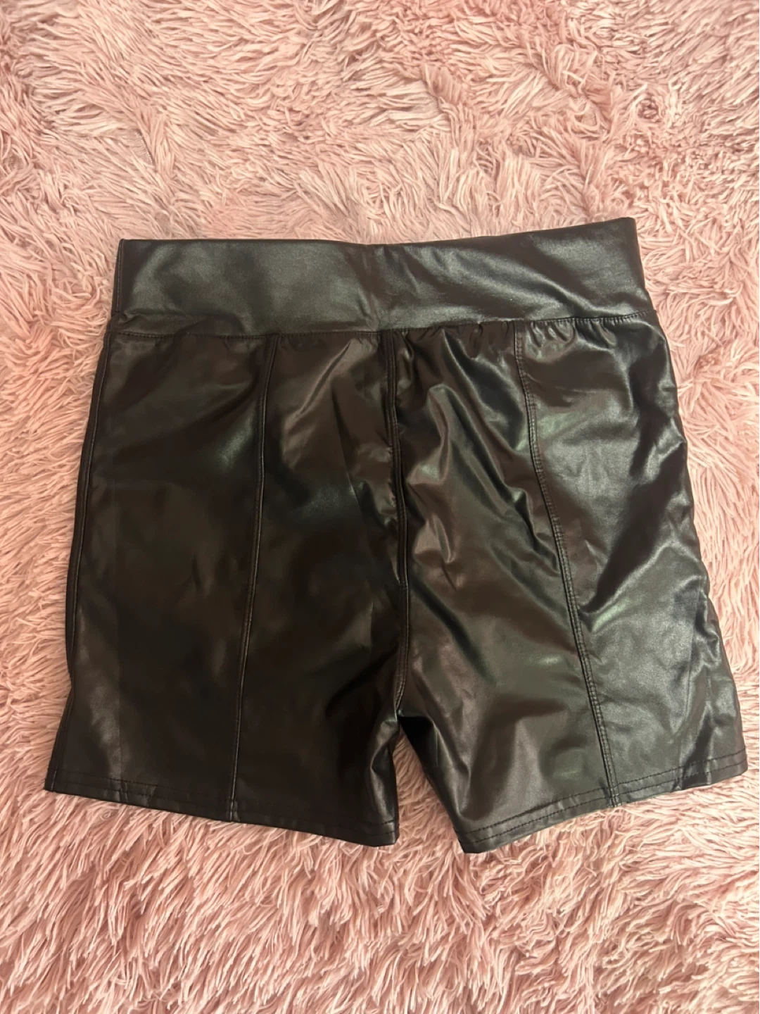 High-waisted faux leather shorts in black. These shorts are made from a shiny, stretchy material. They're perfect for a night out or dressing up an outfit.