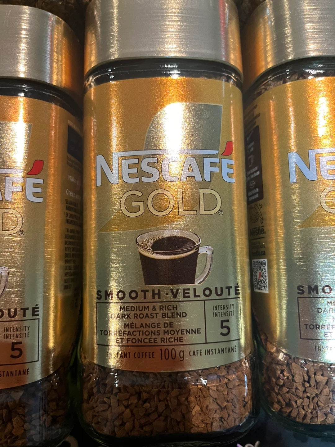 Nescafé Gold Smooth Velouté is a medium & rich dark roast blend. It's an instant coffee with an intensity of 5. Each jar contains 100g of coffee. This coffee is great for a quick and easy cup anytime! (24 pcs available $6 each)