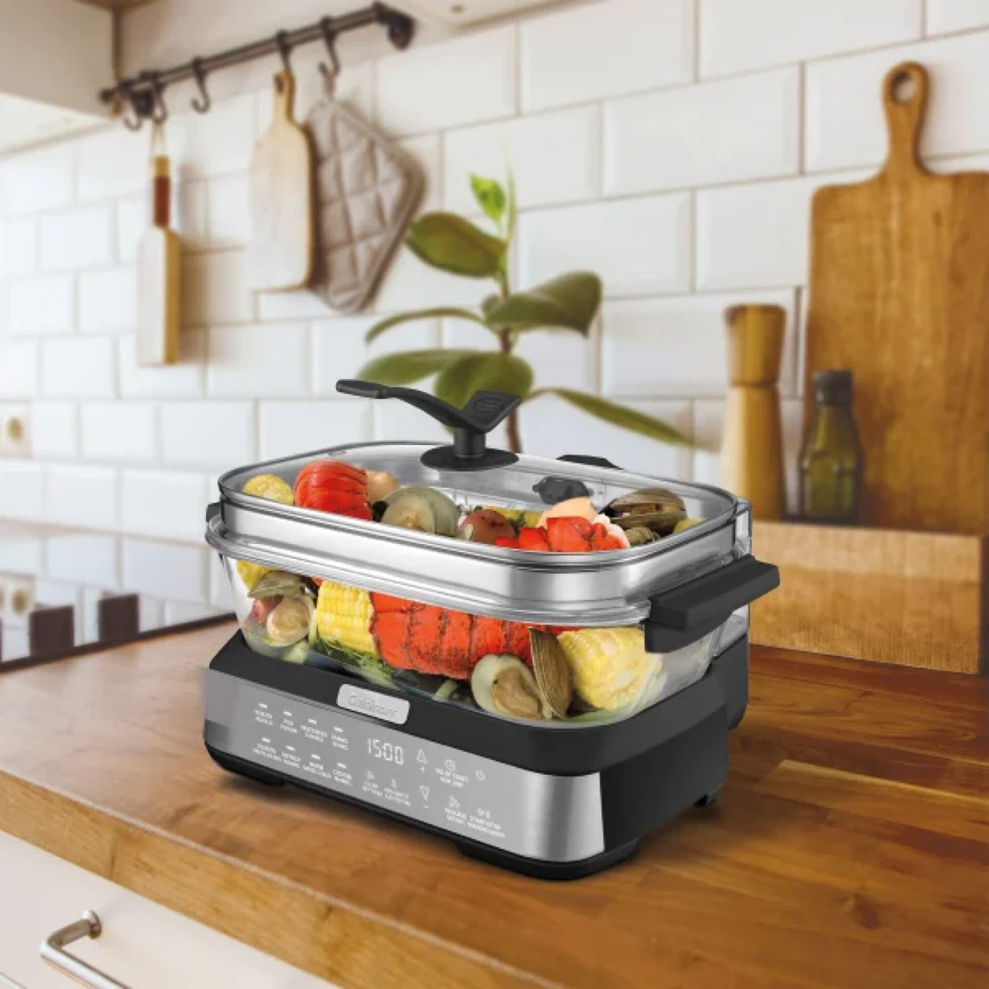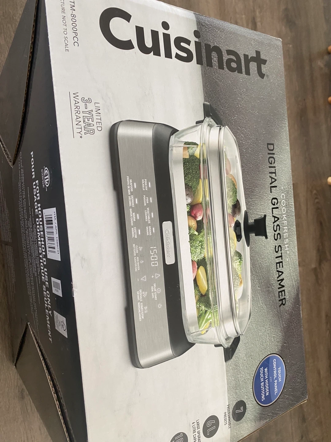 Cuisinart TM-8000PC digital glass steamer. Features touch control panel with hipy touch buttons. Large capacity with 6L bowls. Includes original box.