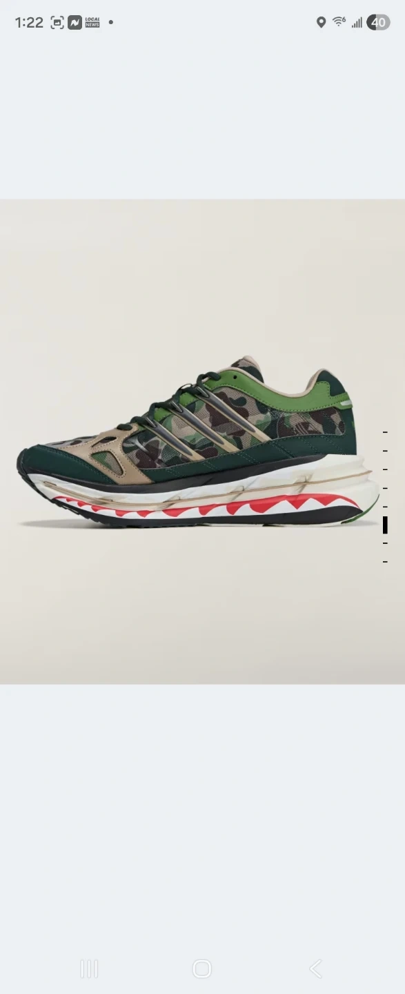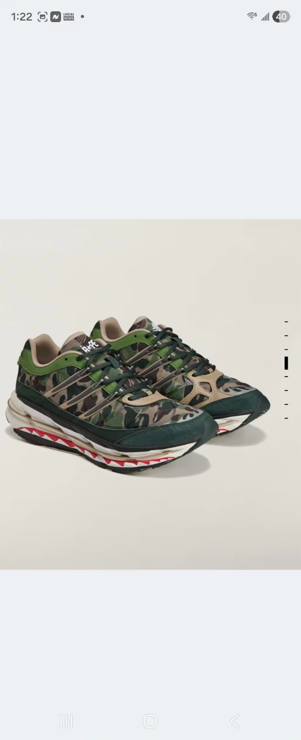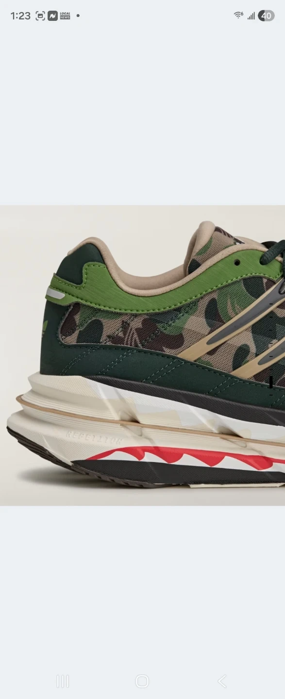 These Adidas x BAPE running shoes feature a signature camouflage pattern. The shoes have a comfortable design with a durable Continental rubber outsole. It's a unique collaboration for any sneaker enthusiast!