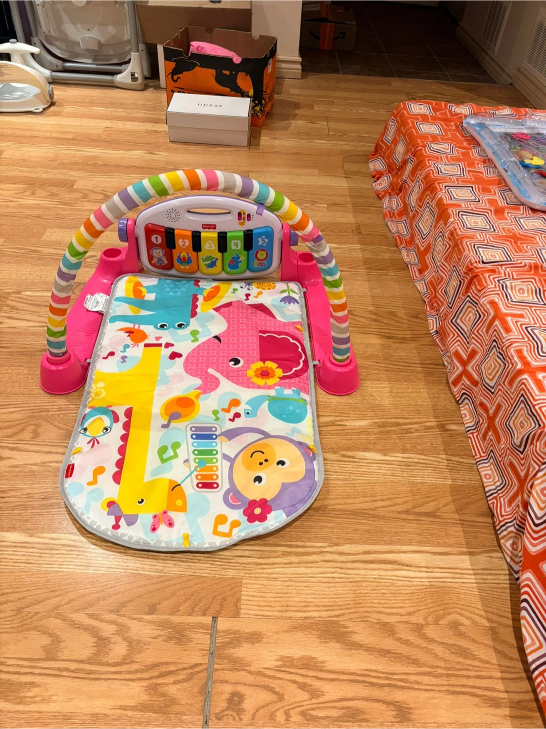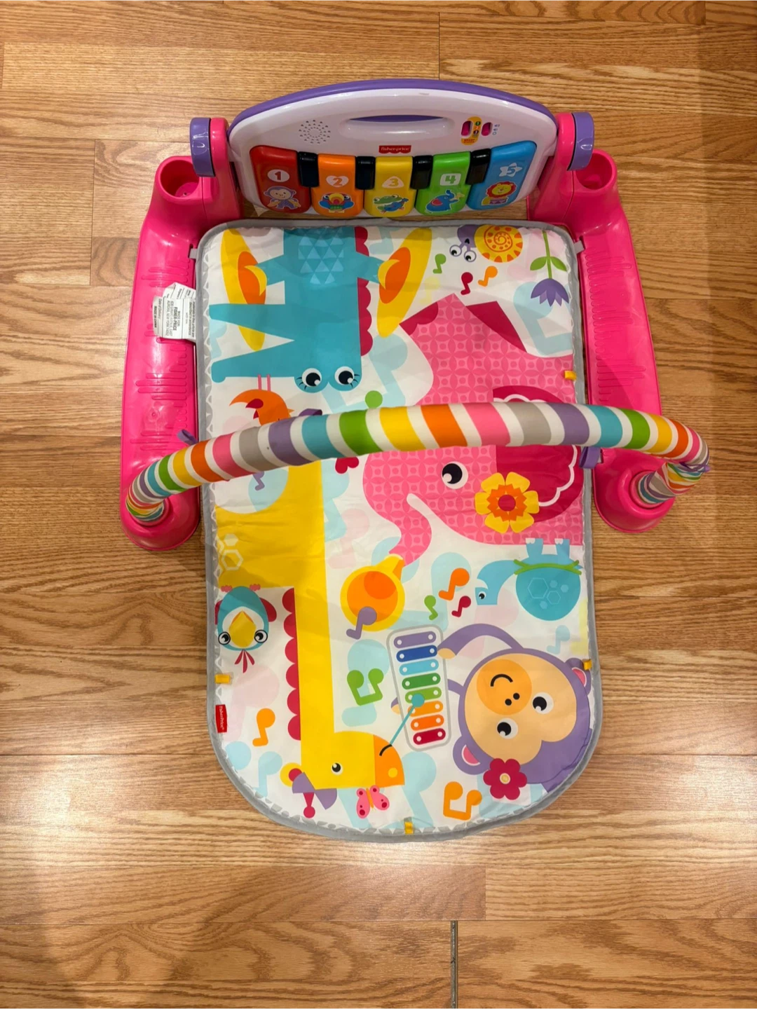 Selling a Fisher-Price Deluxe Kick & Play Piano Gym. It's in great condition and ready for a new little one! It features a soft mat with colourful animal designs The piano can be kicked or played by hand to activate music and lights, encouraging development and sensory skills. The overhead hangings are not there.