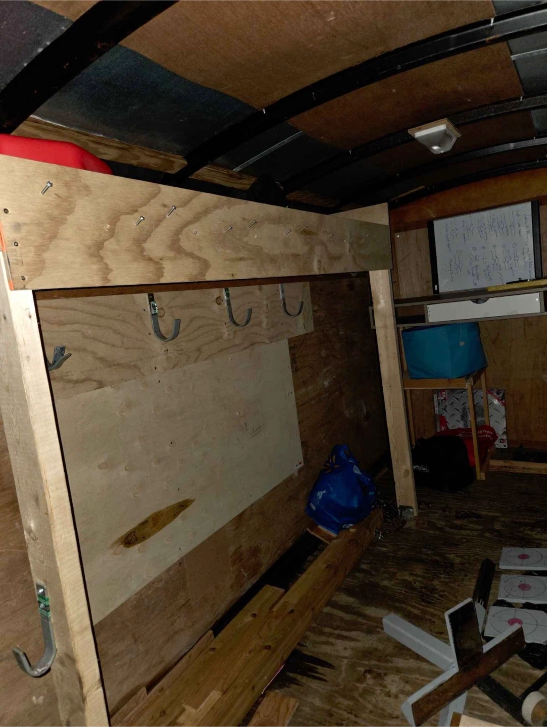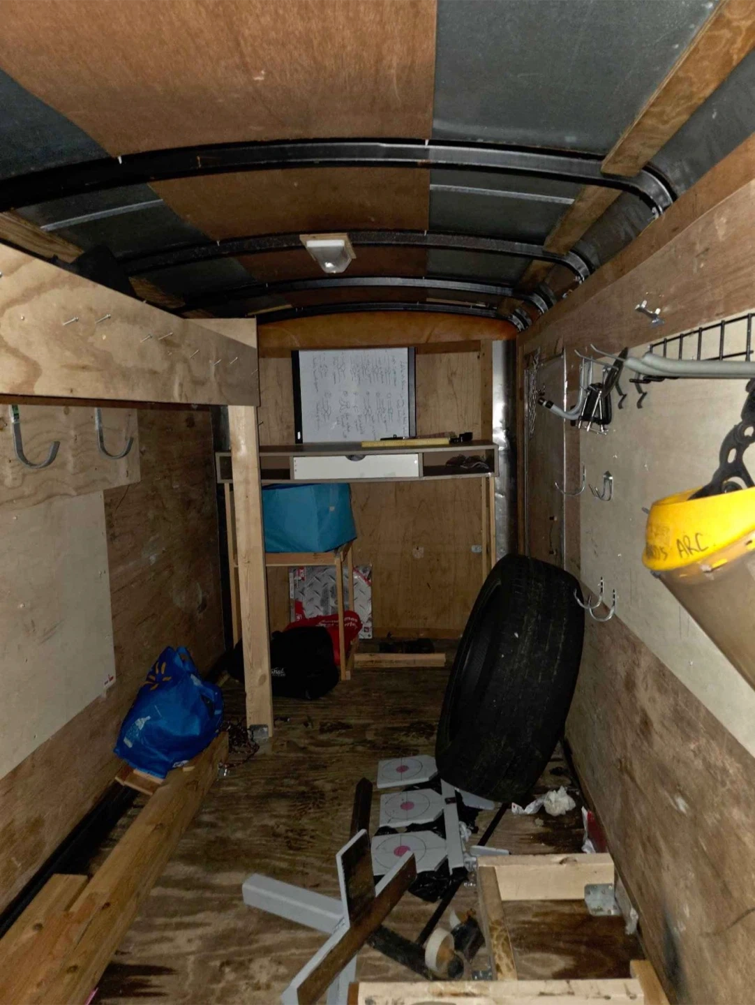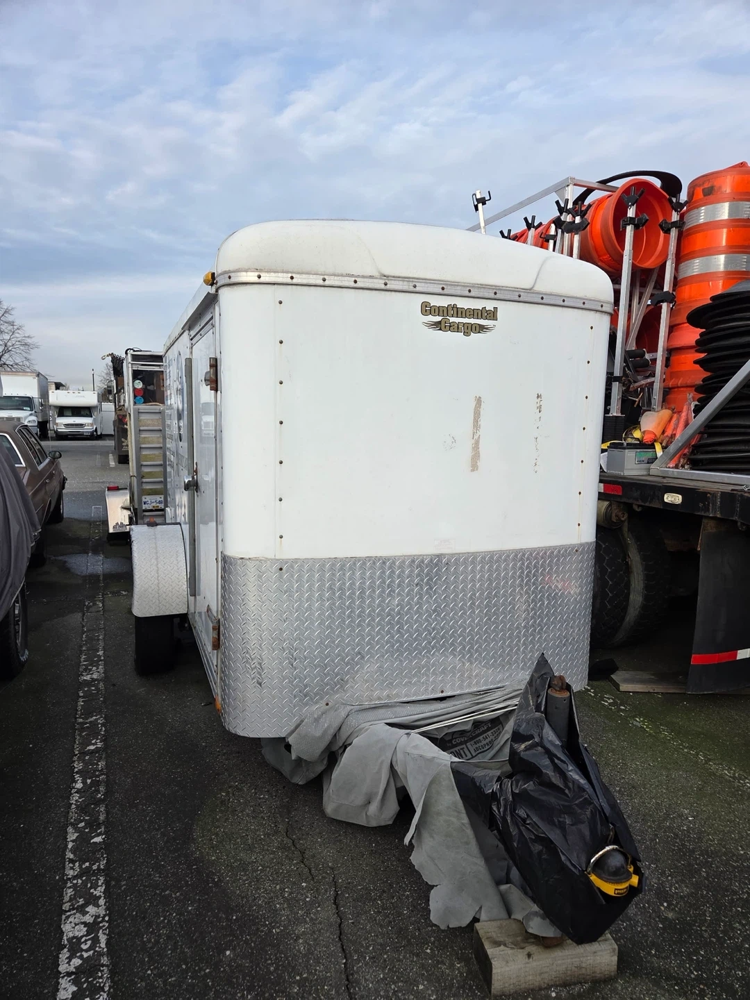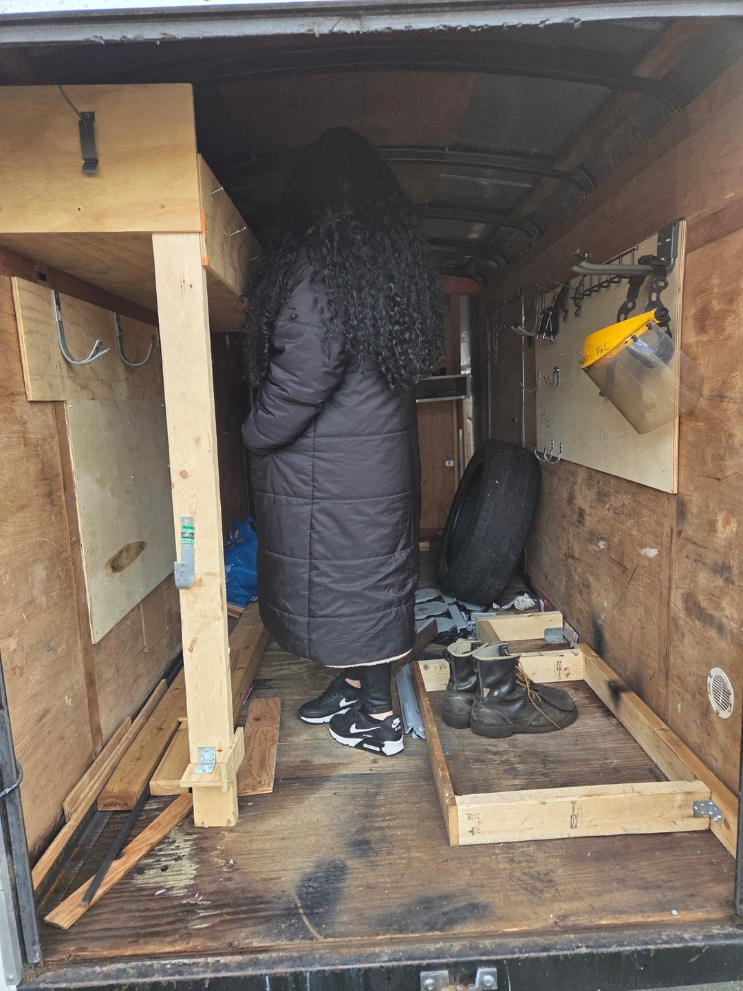 Enclosed cargo trailer. Ideal for mobile welding and fabrication services. Features ample interior space for tools and equipment. Shelving can be removed easily.