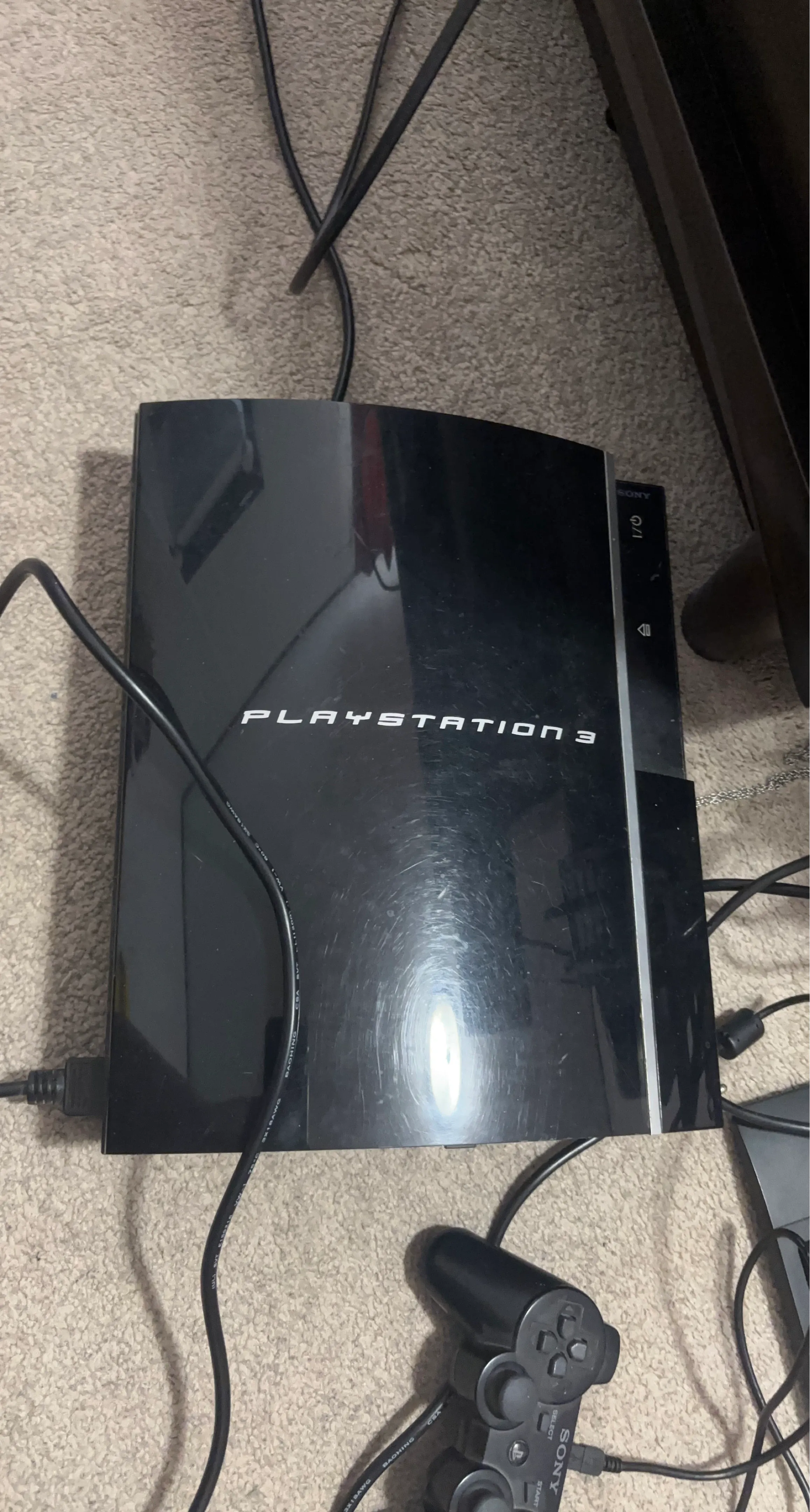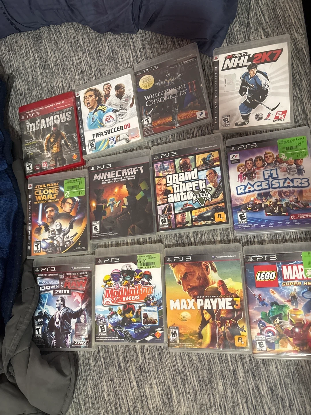 Sony PlayStation 3 console. Comes with a PS3 remote and controller/cable, and several games including NHL 2K7, FIFA Soccer 09, Grand Theft Auto V, LEGO Marvel Super Heroes, Max Payne 3, Mod nation Racers, Smack down vs Raw 2011, White Knight Chronicles II, Star Wars republic heroes, Infamous, Minecraft, and f1 race stars. Some games are rated E for Everyone, some E10+, and some T for Teen.