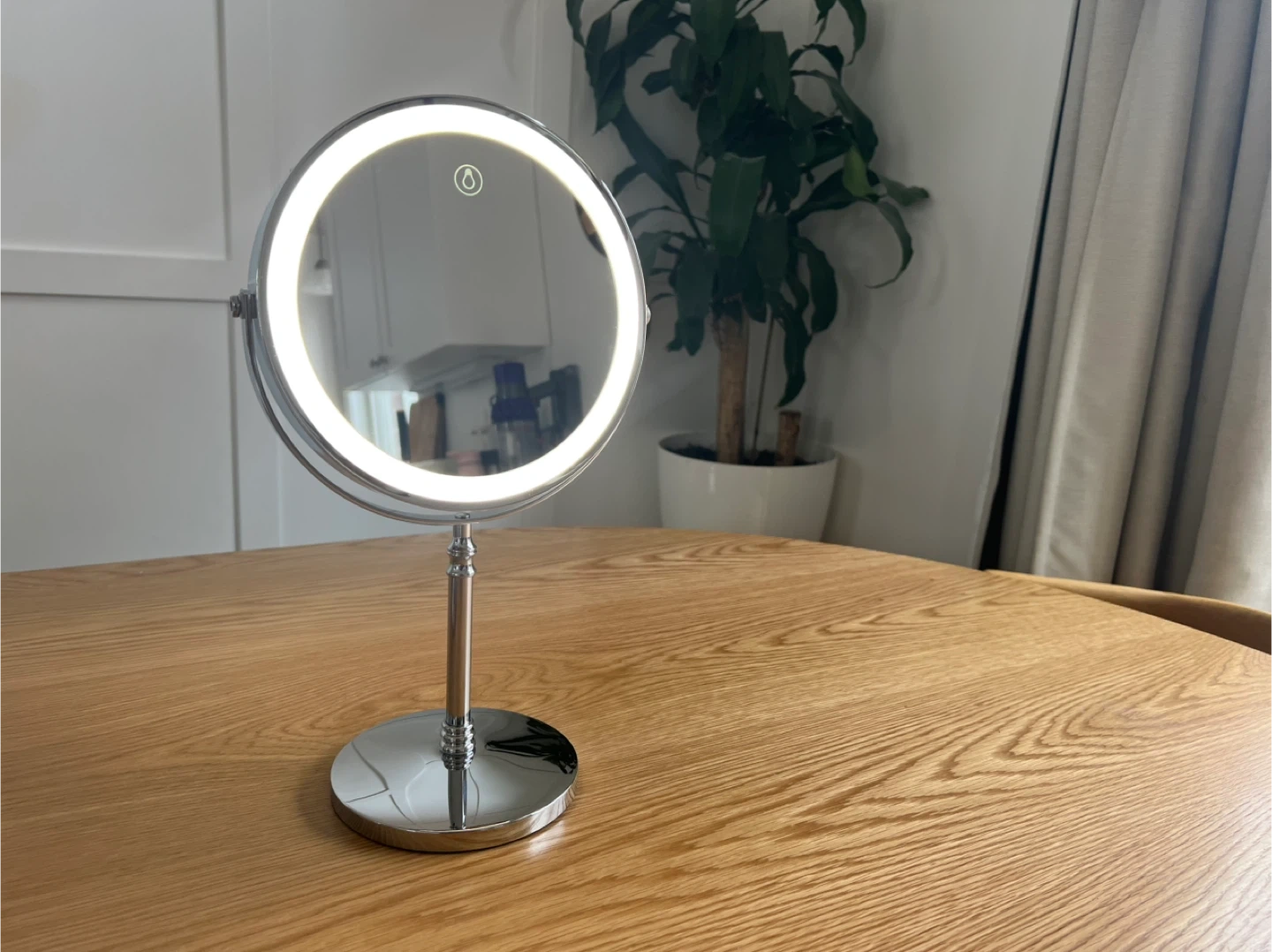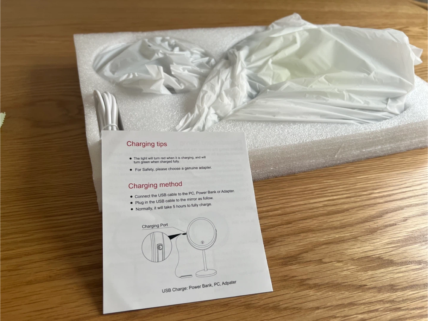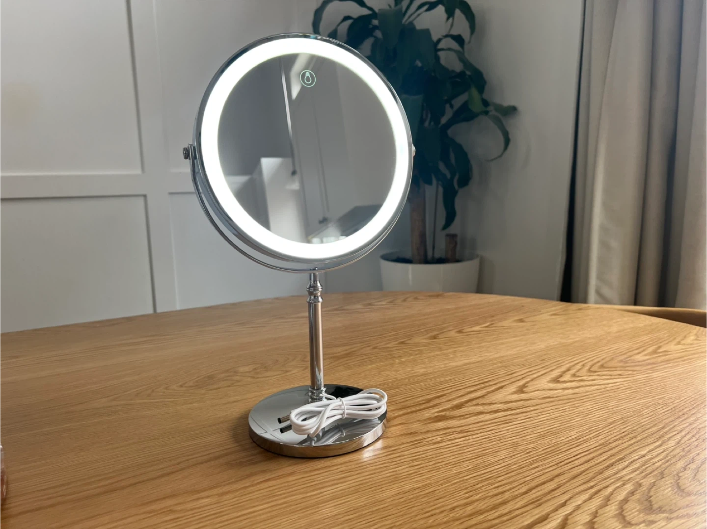 This is an 8-inch LED makeup mirror with 10x magnification. It offers three color temperatures and adjustable brightness. Features a rechargeable battery and includes a USB cable.
