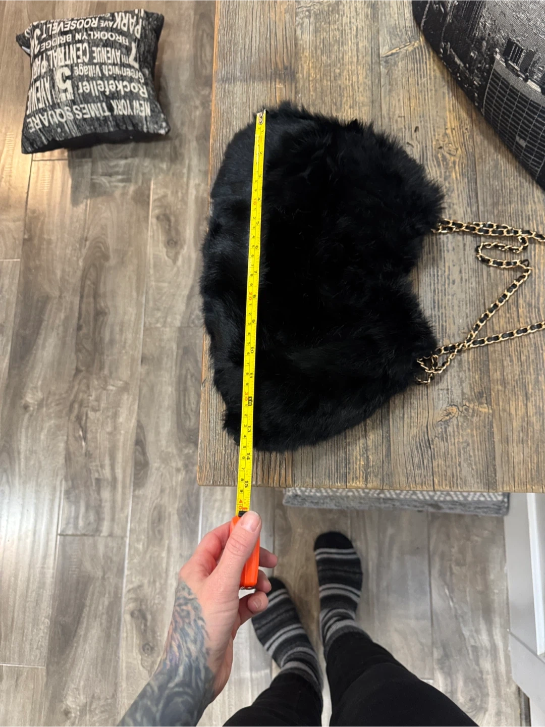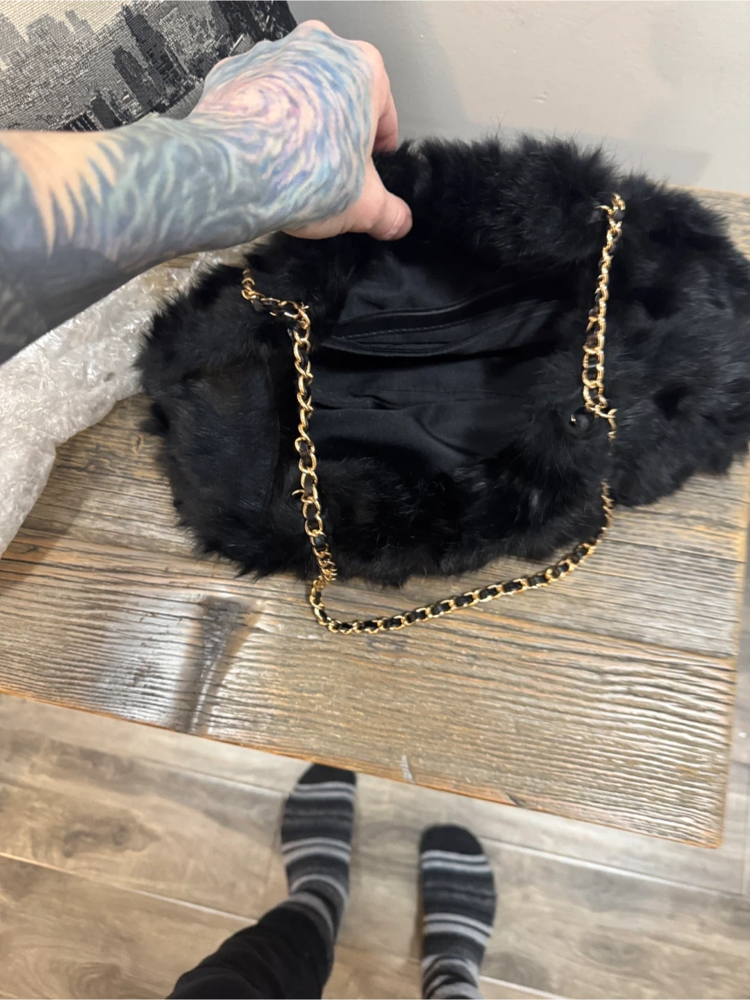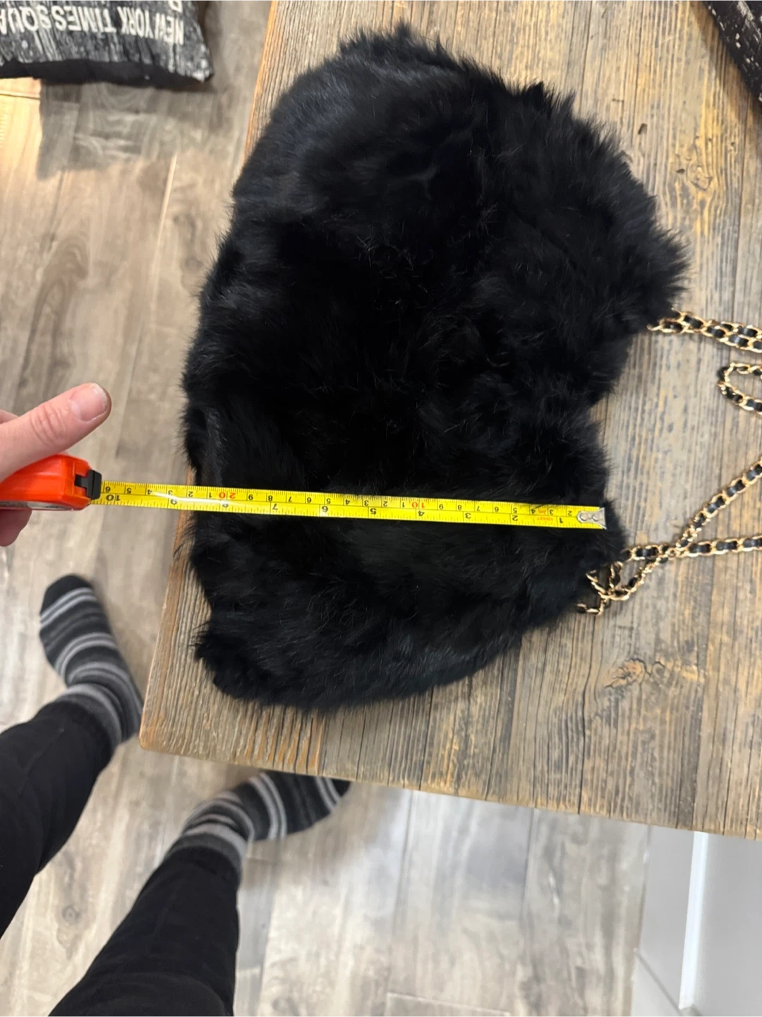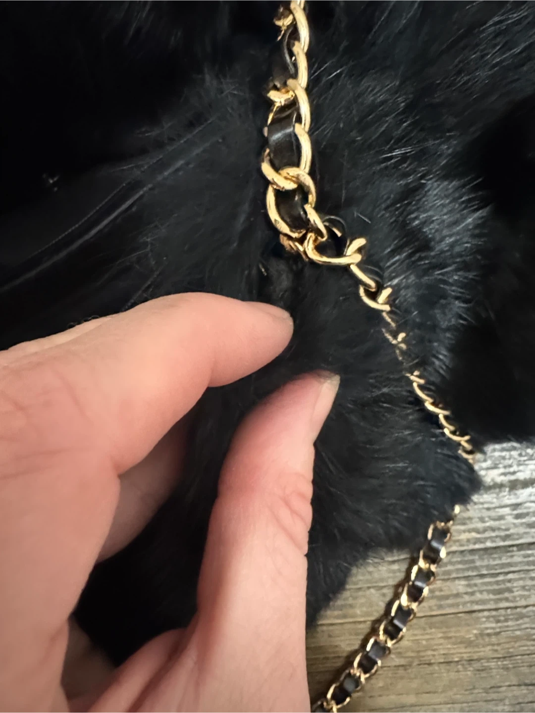 Elevate your style with this chic black faux fur shoulder bag. Featuring a stylish chain strap, this bag is perfect for any occasion. Peeling at loop. Faux leather