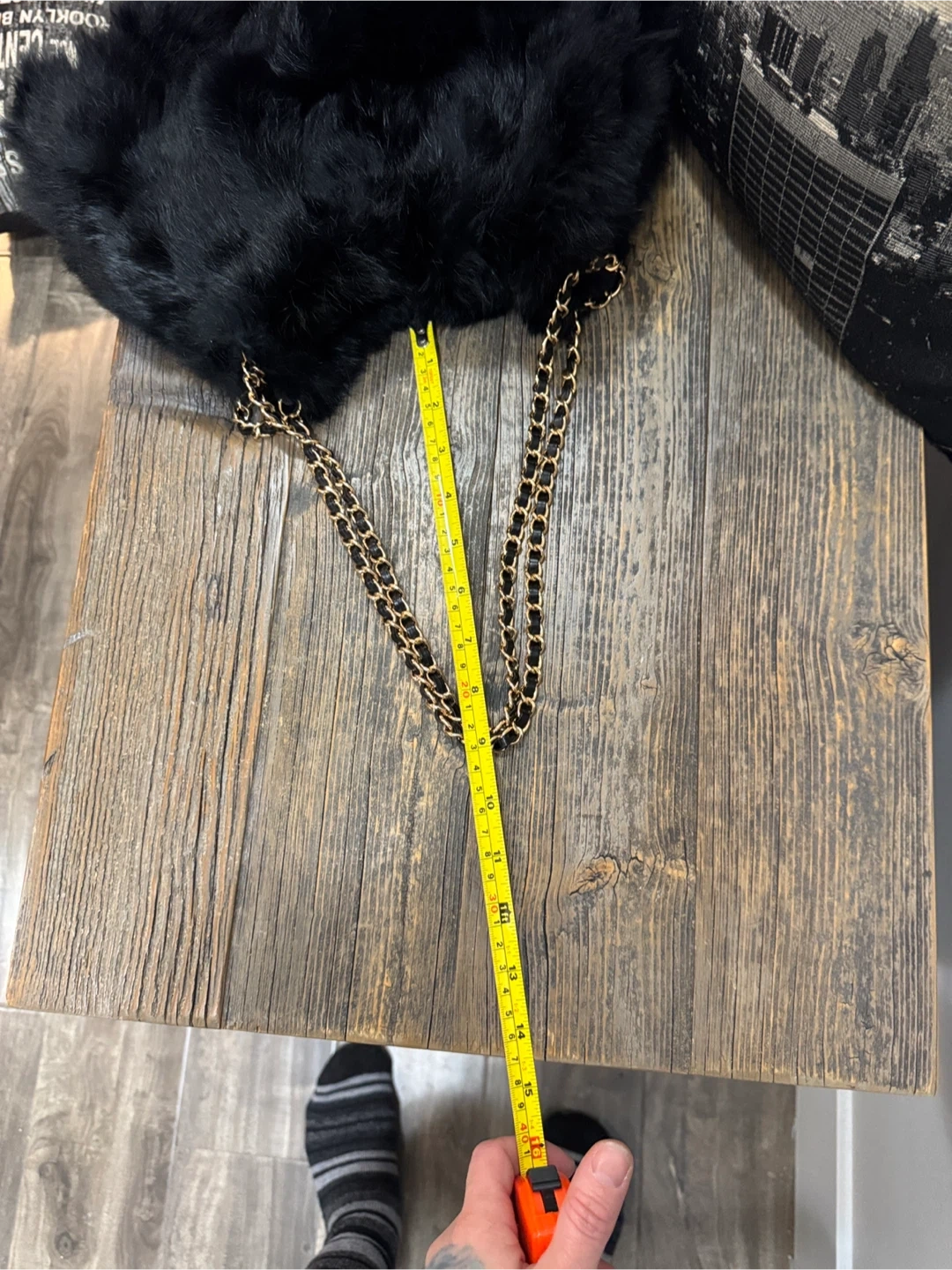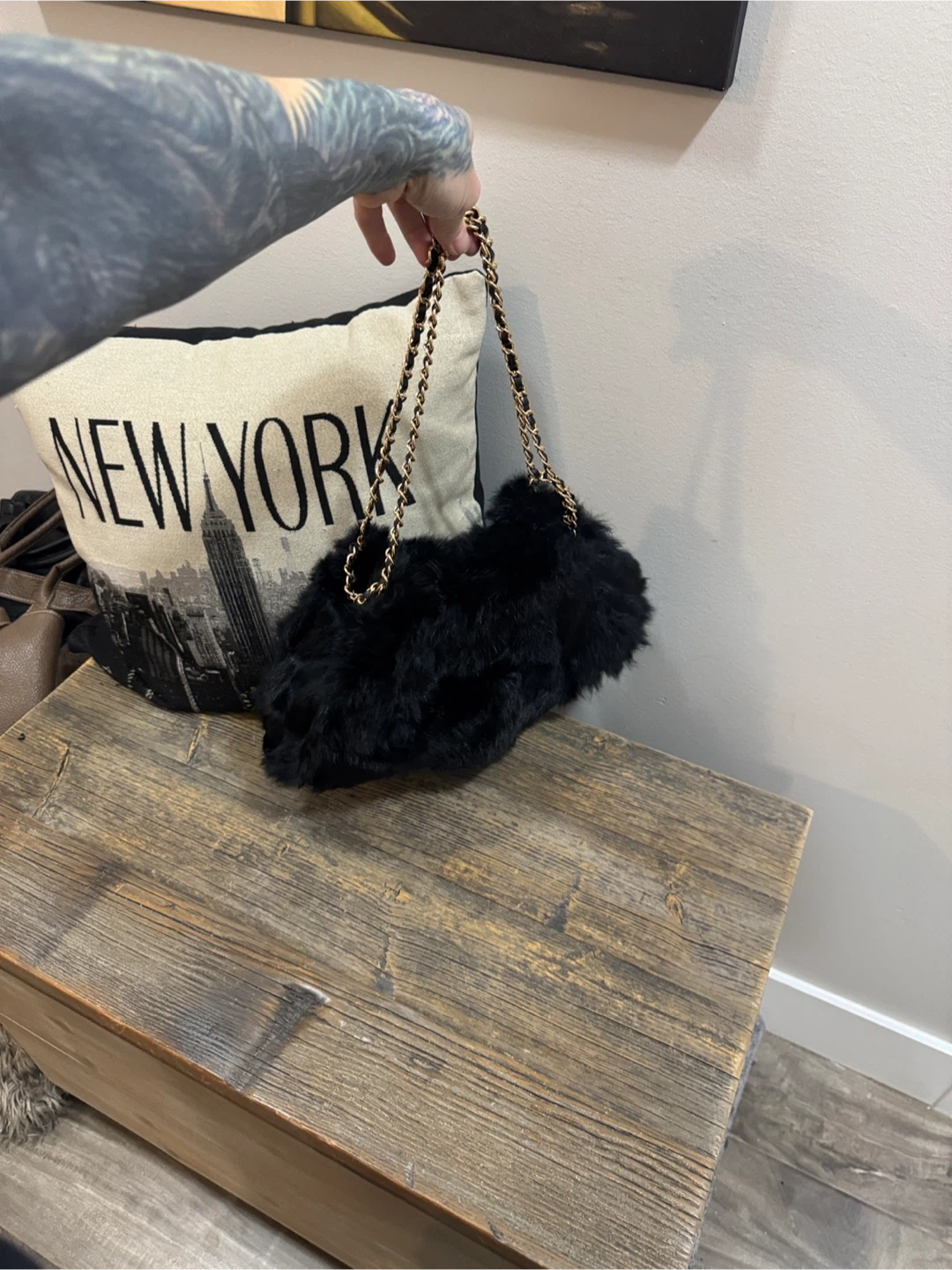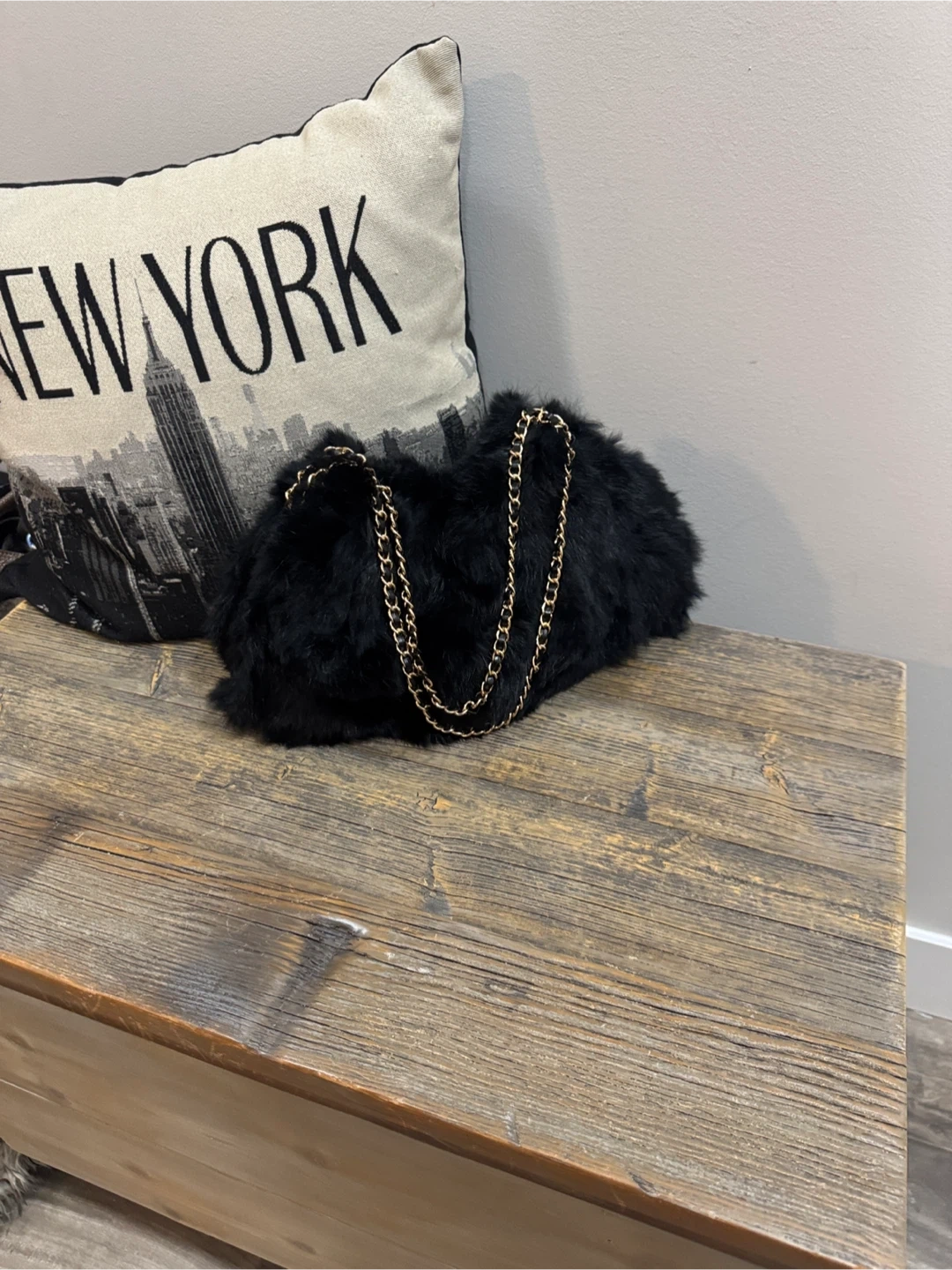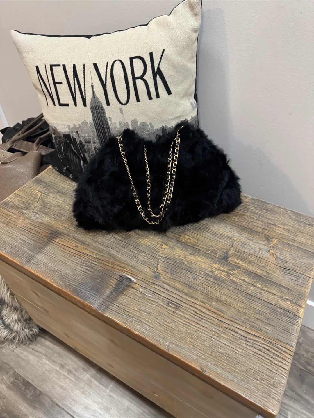 Elevate your style with this chic black faux fur shoulder bag. Featuring a stylish chain strap, this bag is perfect for any occasion. Peeling at loop. Faux leather