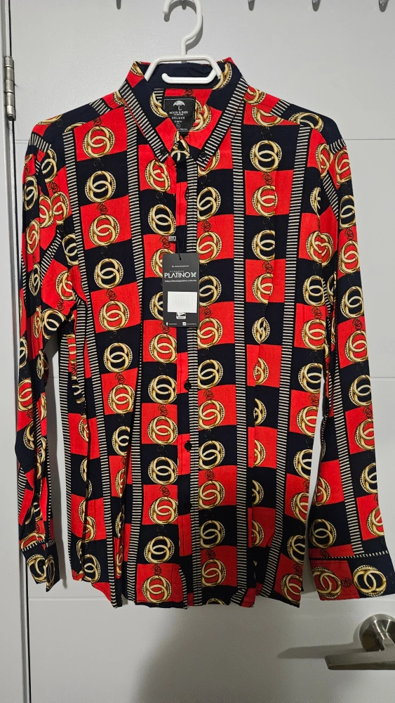 Long sleeve button-up shirt. Red, black, and gold pattern. Size Large - Fits Medium. New with tags.