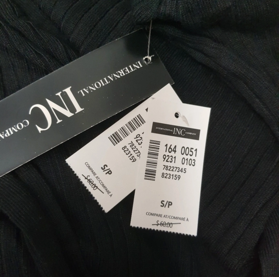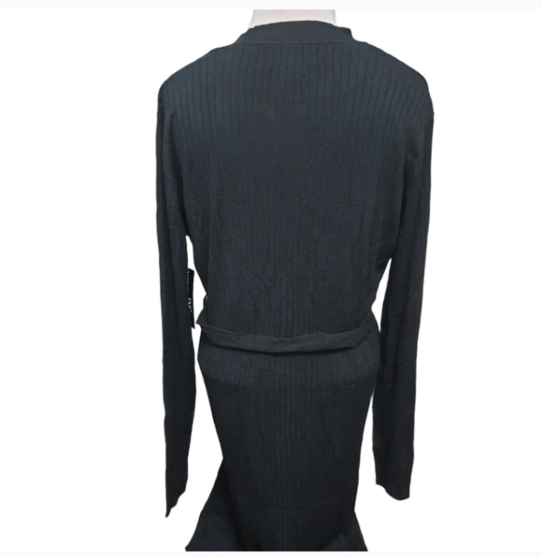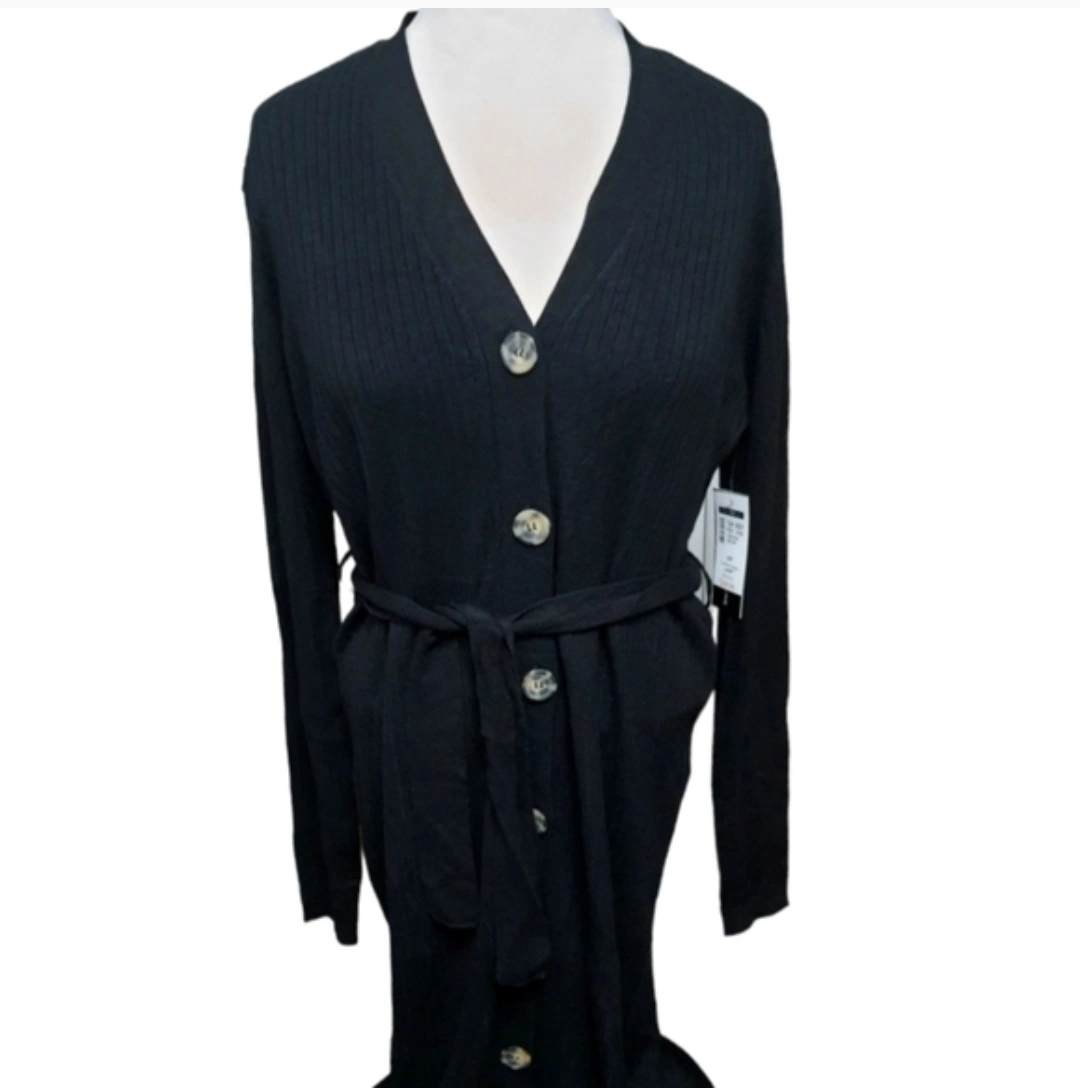 INC International Concepts black ribbed V-neck cardigan dress. It's available in sizes S, M, L, and XL. With a button-front closure and a matching belted waist. The material is a soft knit blend, perfect for layering or wearing on its own.