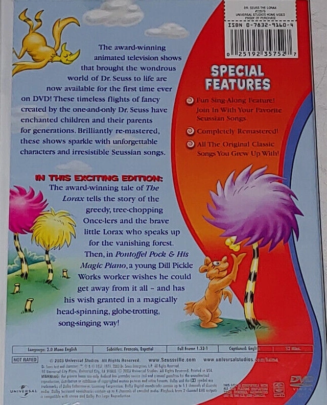 Dr. Seuss The Lorax DVD - Includes Pontoffel Pock & His Magic Piano. No scratches. Retails $20+. Located in Summerside, SE London. Smoke-free home. Message to arrange an afternoon/evening pickup only.