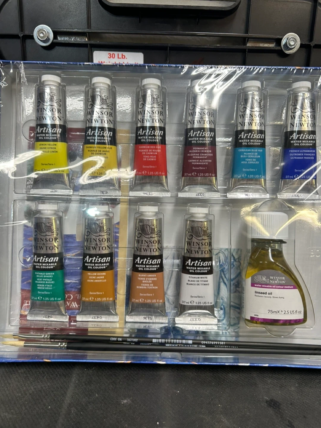 This is a 14-piece Winsor & Newton Artisan water mixable oil colour studio set. It includes various colours in tubes, two brushes, and a bottle of linseed oil. The colours are oil-based but clean up with water.