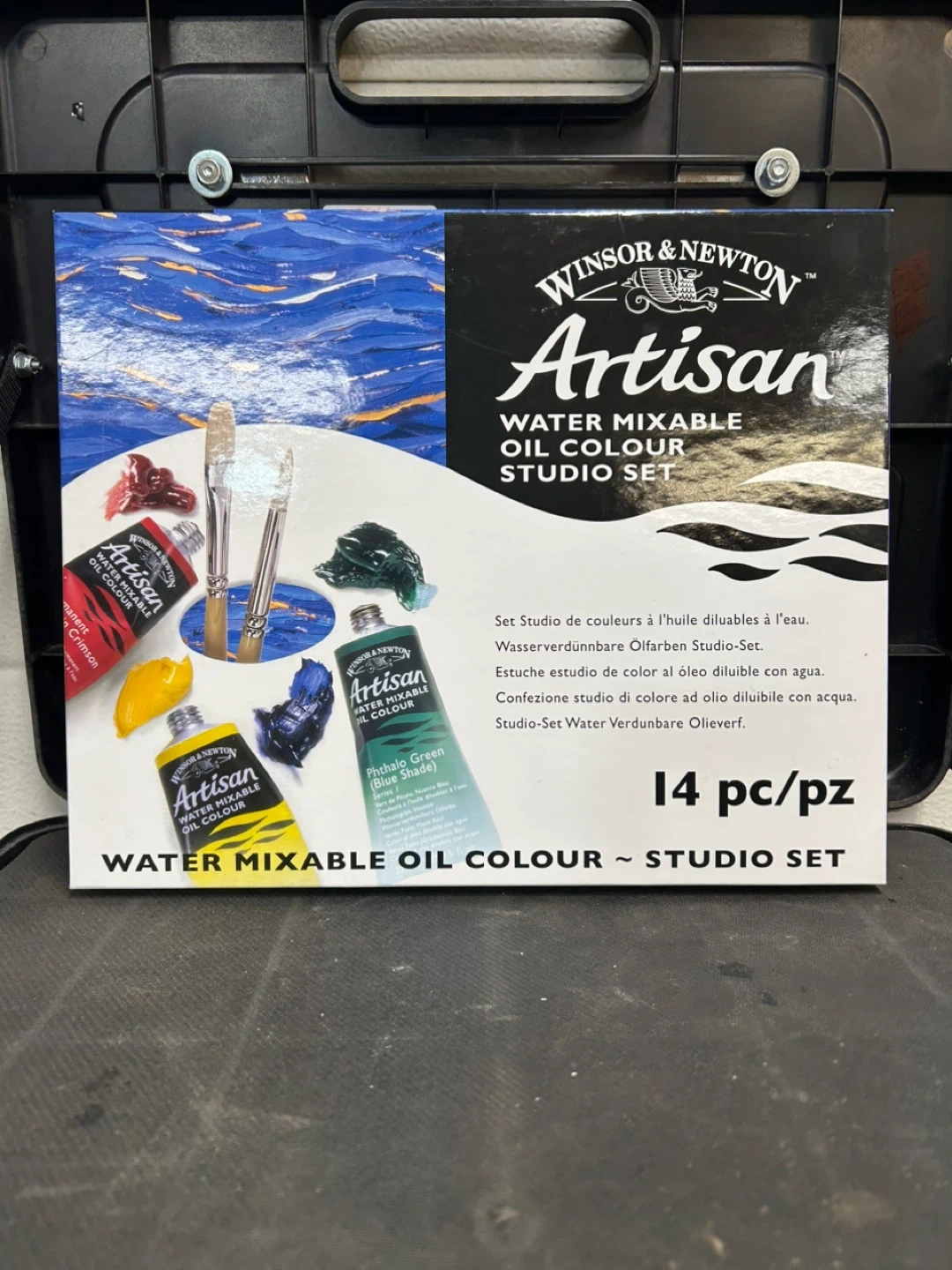 This is a 14-piece Winsor & Newton Artisan water mixable oil colour studio set. It includes various colours in tubes, two brushes, and a bottle of linseed oil. The colours are oil-based but clean up with water.
